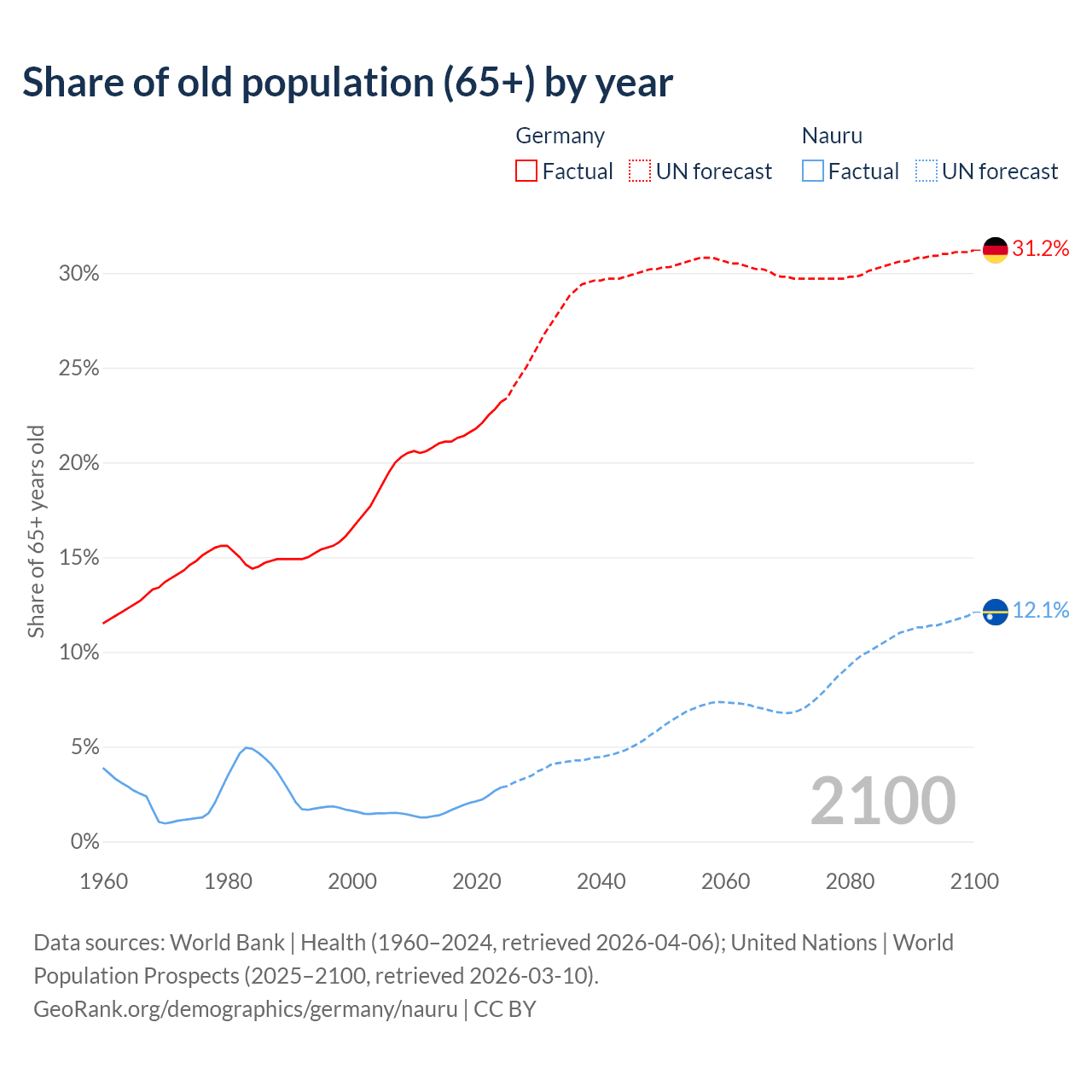 The share of older people aged 65 and over is 23.2% in Germany and 2.85% in Nauru. Life expectancy in Germany compared to Nauru .