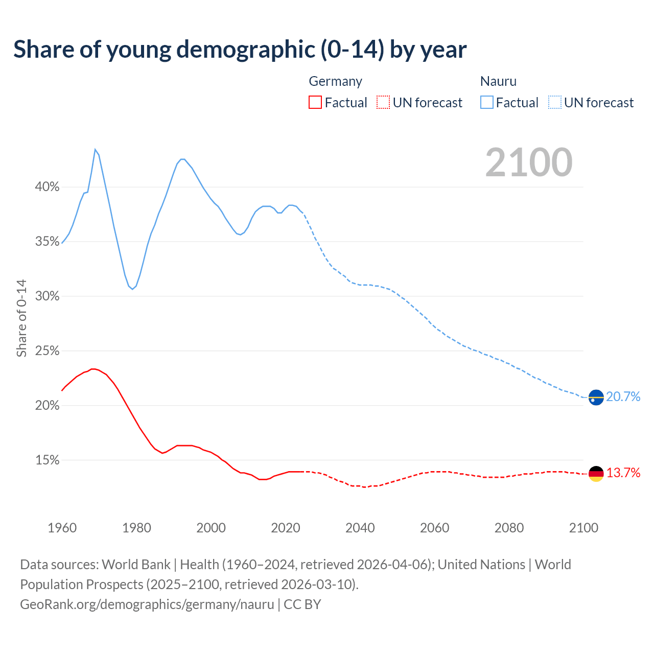 - The share of young demographic (0-15 years old) in Germany is 13.9% vs 37.8% in Nauru.