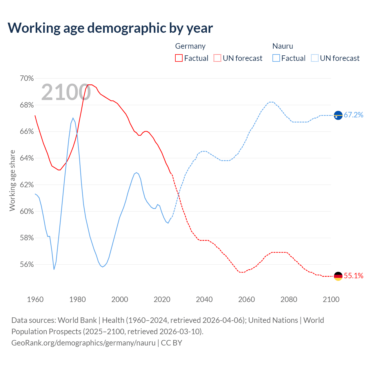 - Germany has 51.9M working age adults (aged 15-64) vs 7.2K in Nauru.