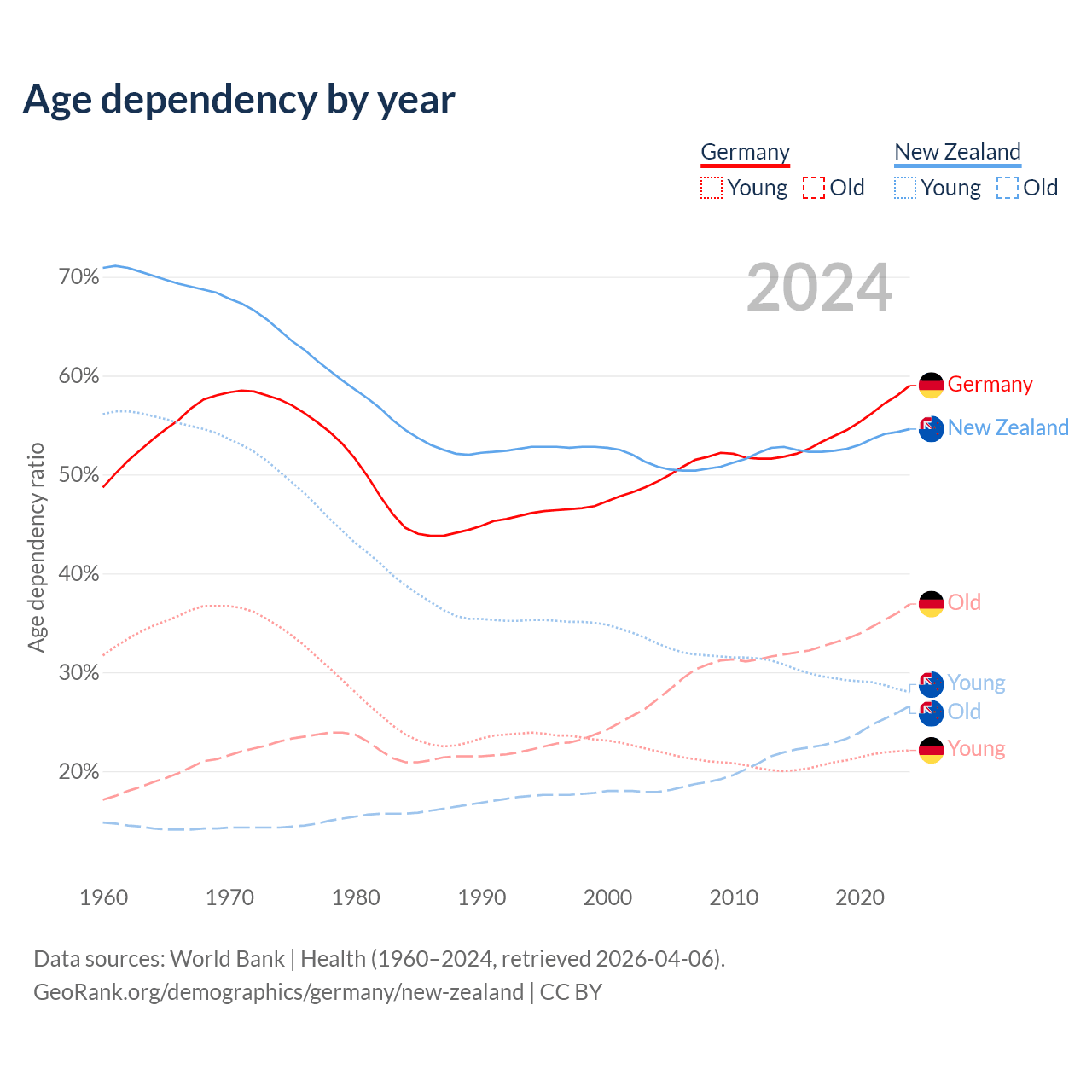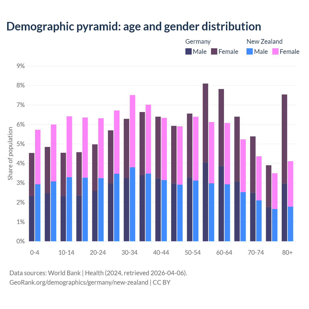 - Germany is ranked 9/196 by median age (oldest to youngest) vs 56/196 for New Zealand.