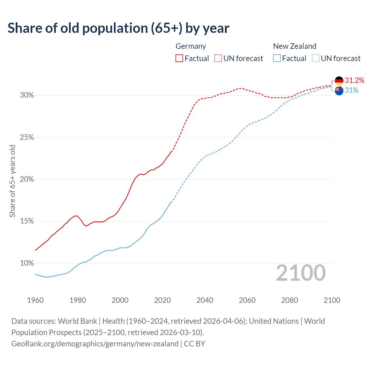 The share of older people aged 65 and over is 23.2% in Germany and 17.2% in New Zealand. Life expectancy in Germany compared to New Zealand .