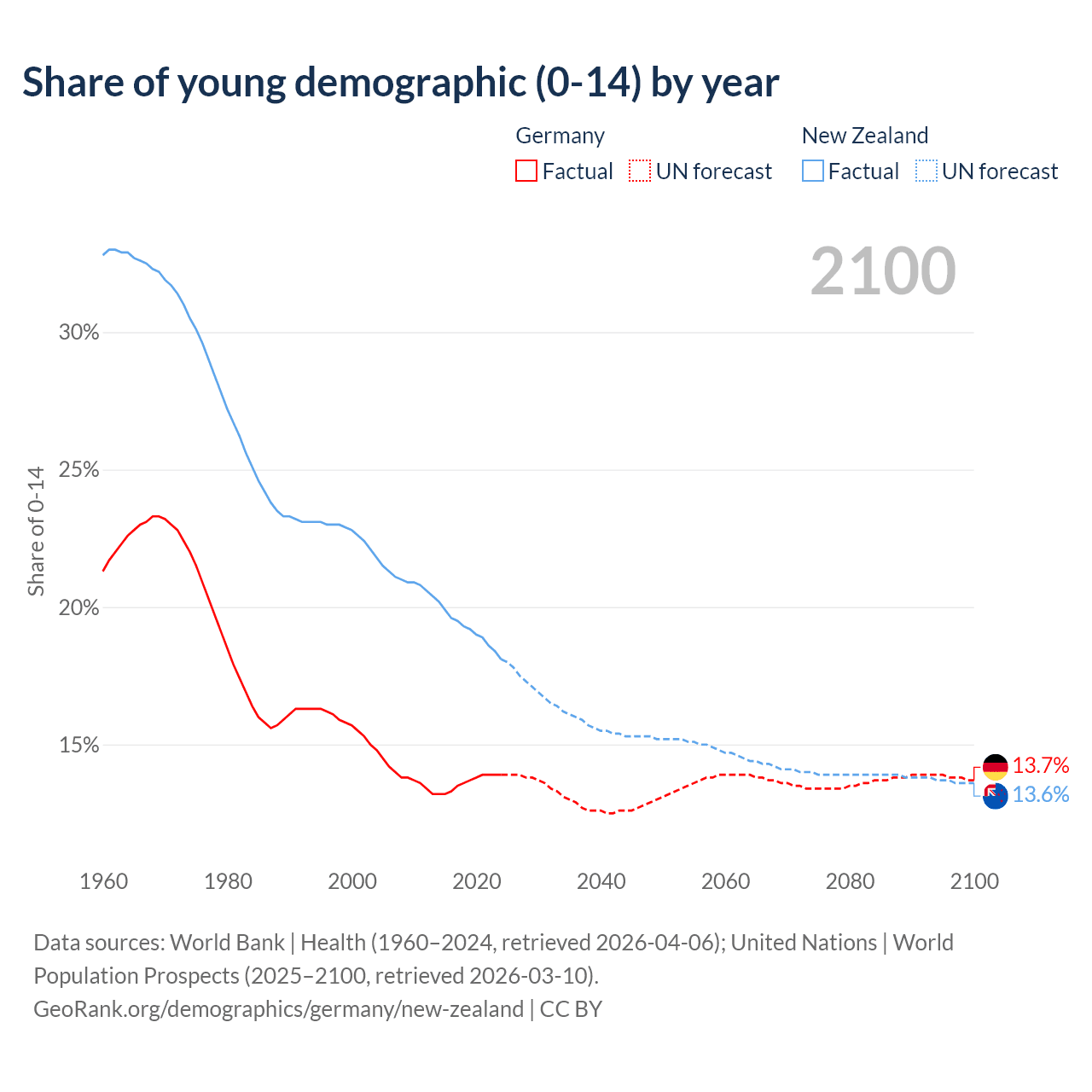 - The share of young demographic (0-15 years old) in Germany is 13.9% vs 18.1% in New Zealand.