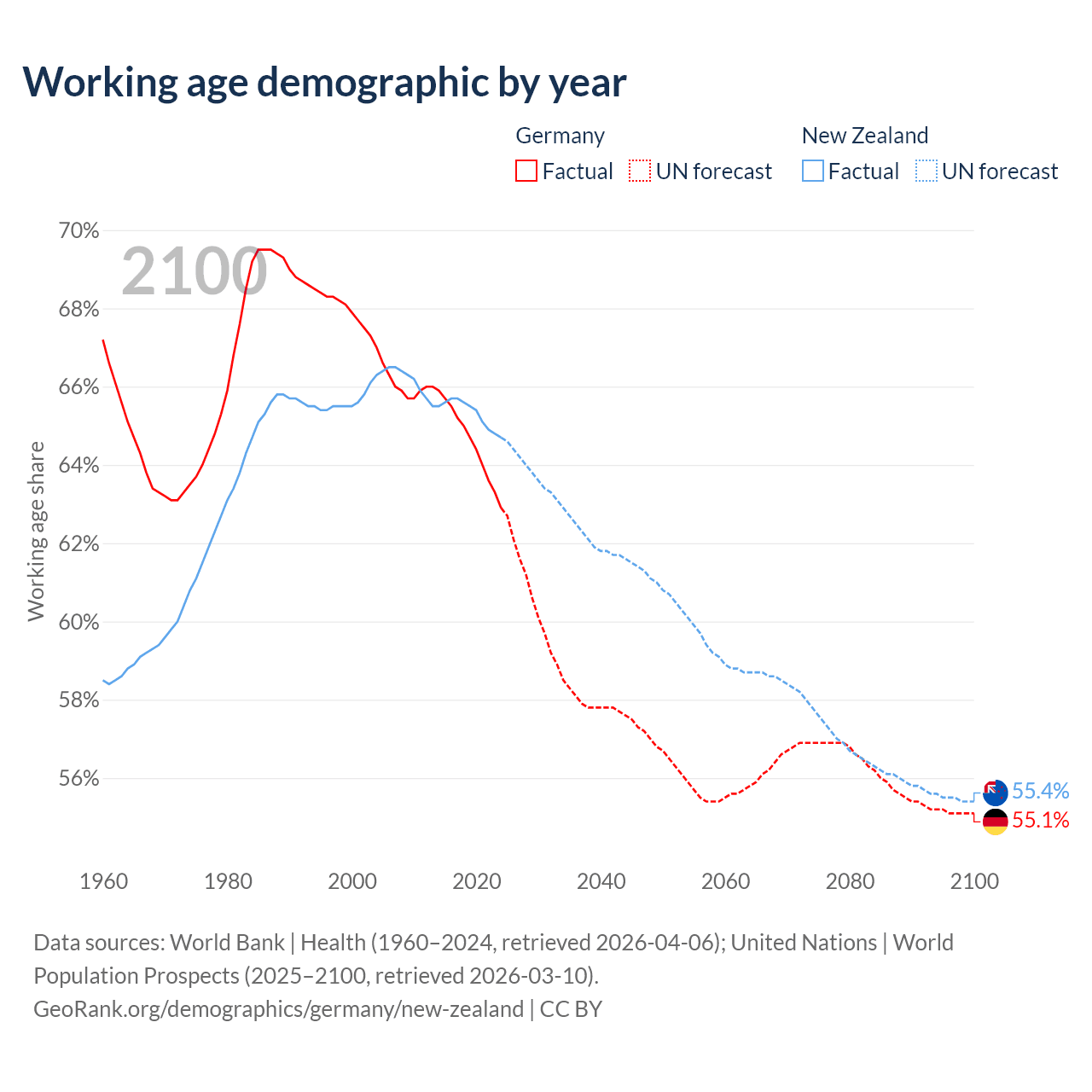 - Germany has 51.9M working age adults (aged 15-64) vs 3.48M in New Zealand.
