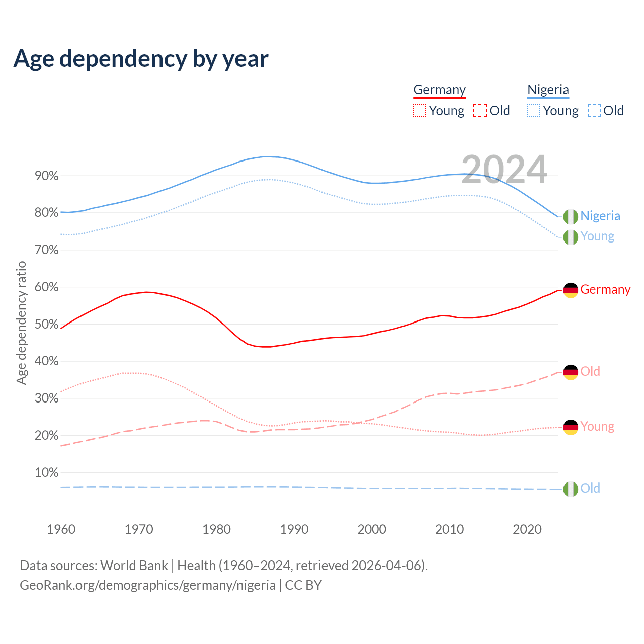 - Germany is ranked 9/196 by median age (oldest to youngest) vs 178/196 for Nigeria.