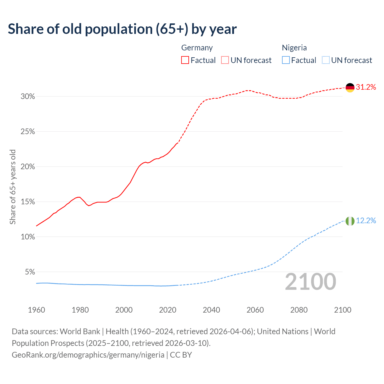 The share of older people aged 65 and over is 23.2% in Germany and 3.05% in Nigeria. Life expectancy in Germany compared to Nigeria .