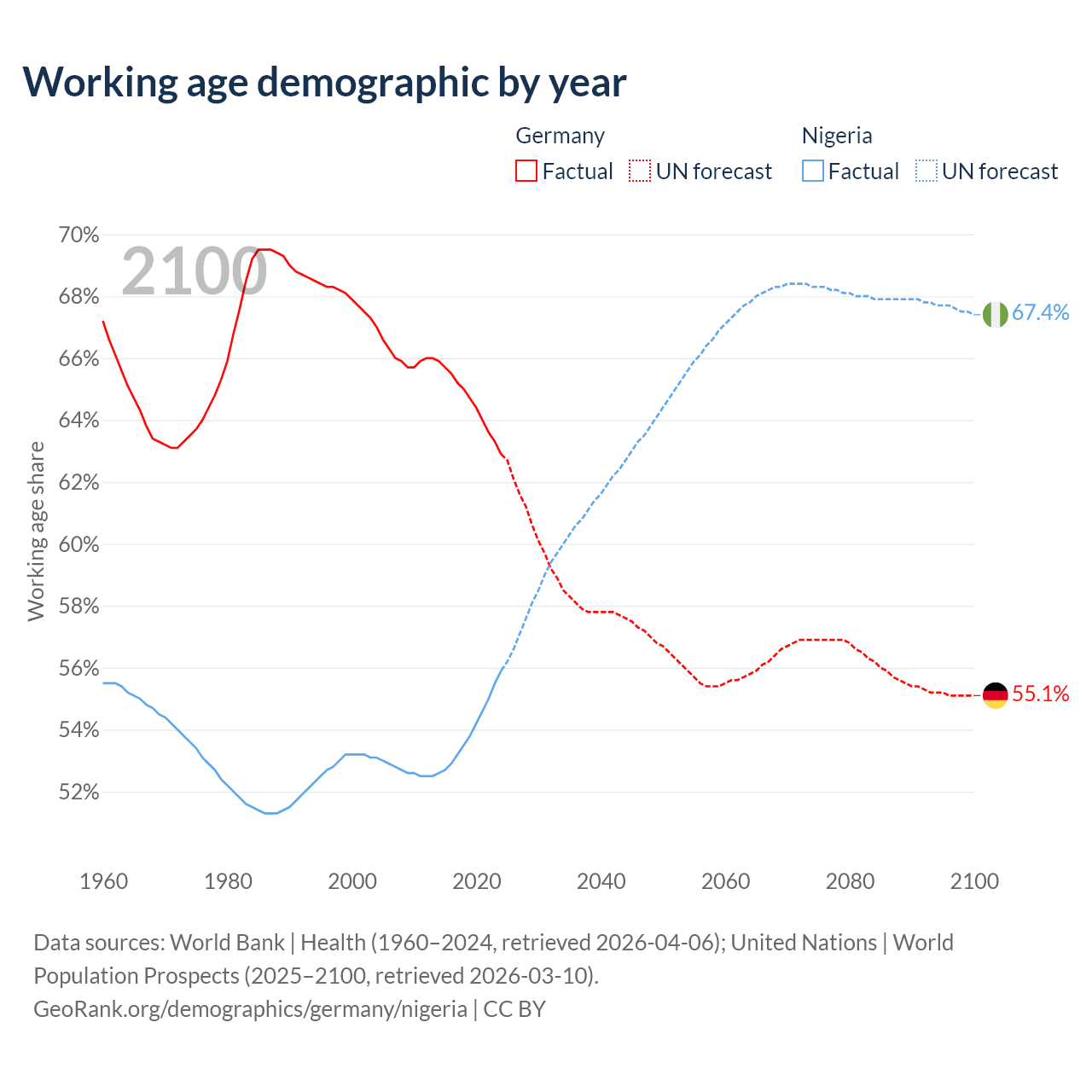 - Germany has 51.9M working age adults (aged 15-64) vs 136M in Nigeria.