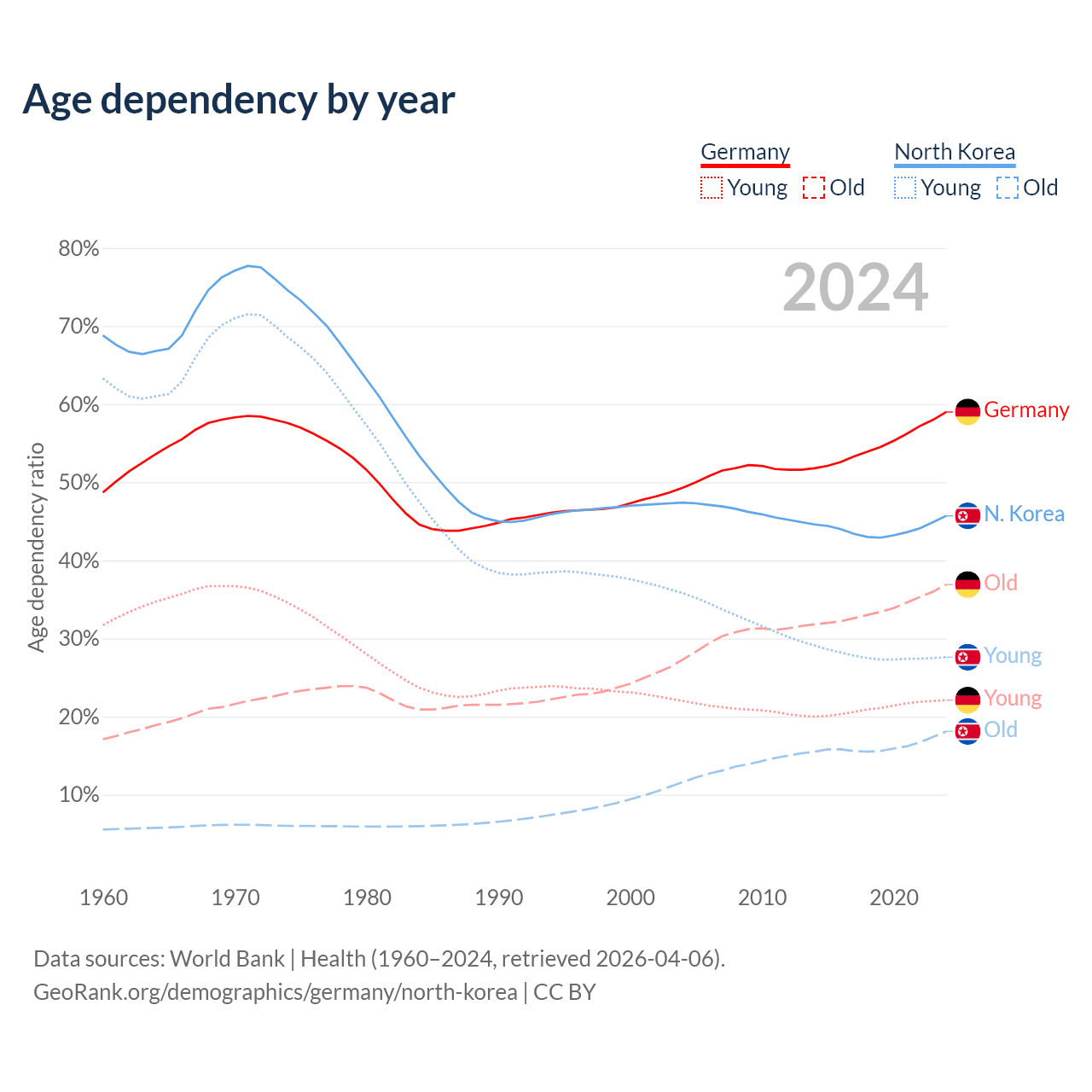 - Germany is ranked 9/196 by median age (oldest to youngest) vs 62/196 for North Korea.