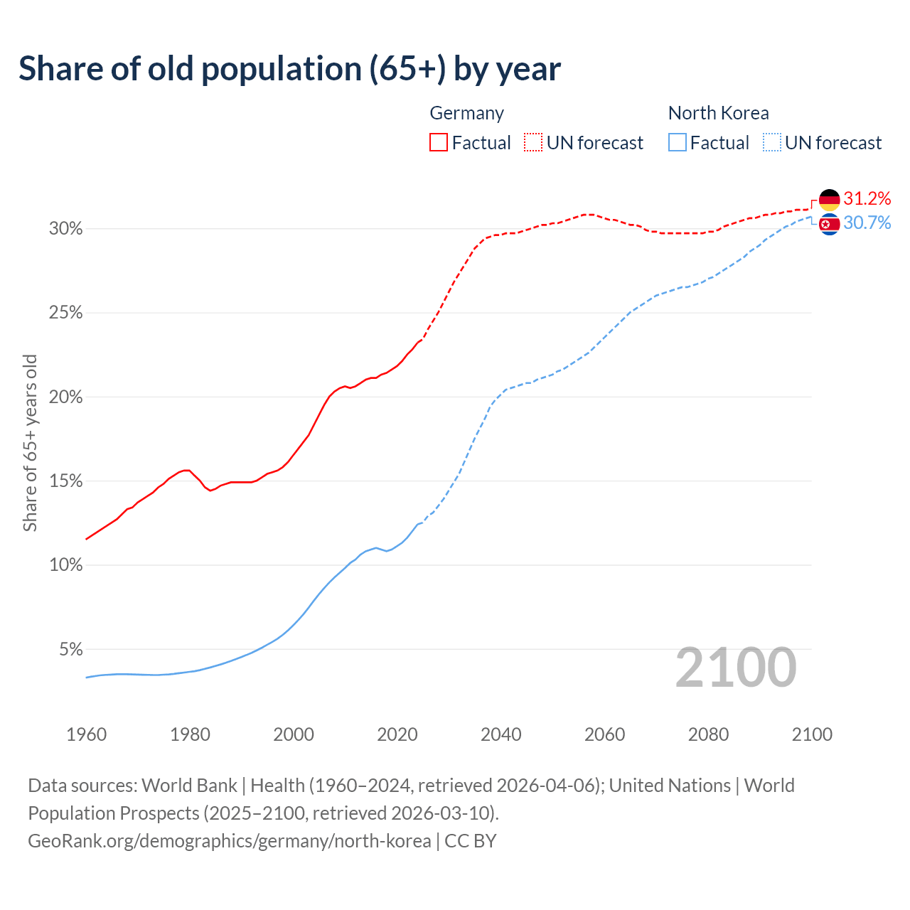 The share of older people aged 65 and over is 23.2% in Germany and 12.4% in North Korea. Life expectancy in Germany compared to North Korea .