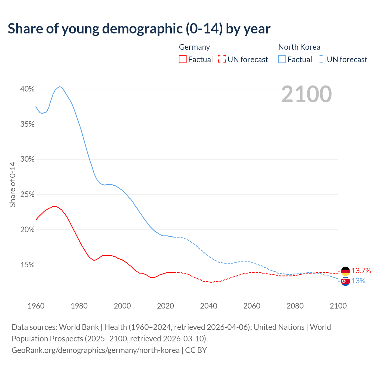 - The share of young demographic (0-15 years old) in Germany is 13.9% vs 18.9% in North Korea.