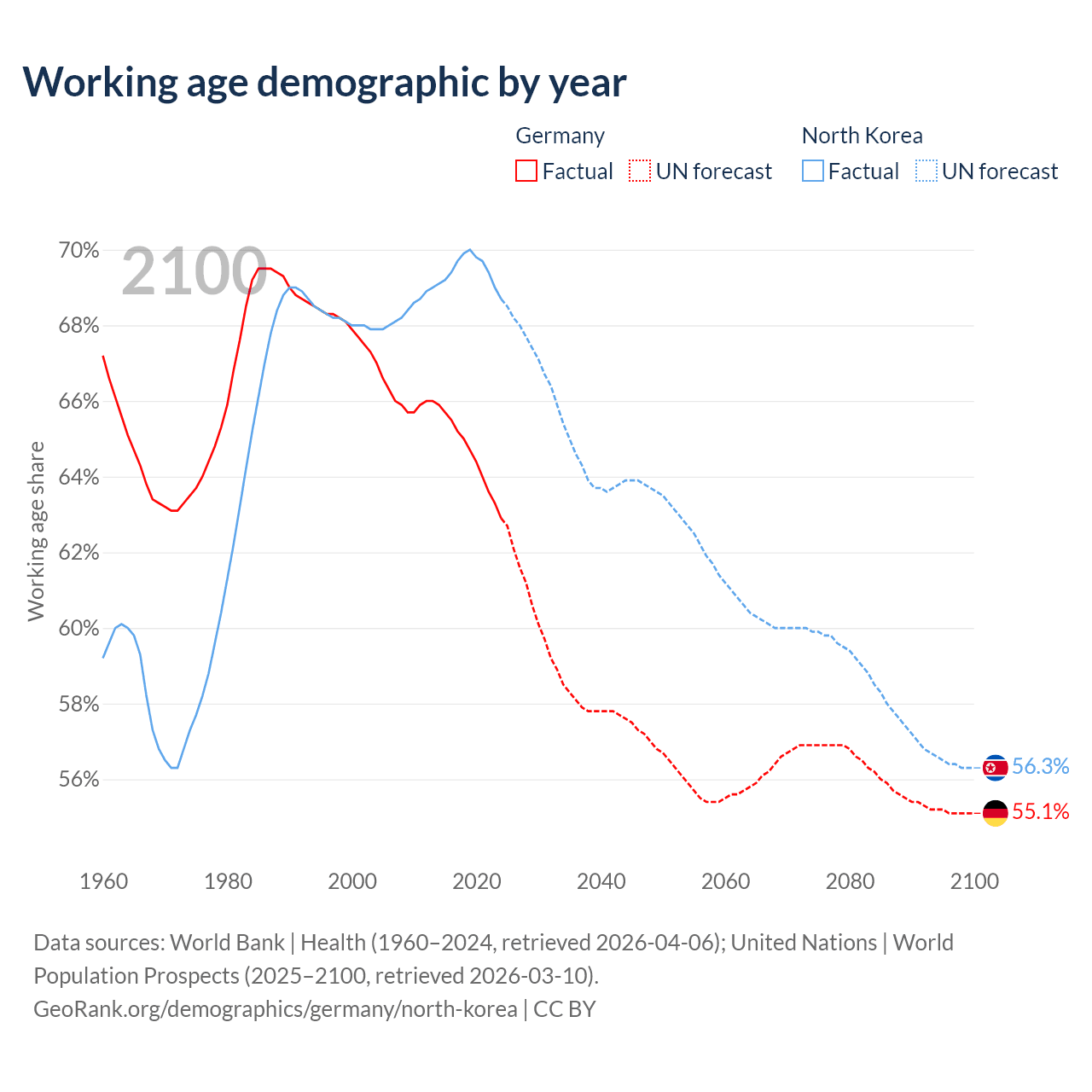 - Germany has 51.9M working age adults (aged 15-64) vs 18.3M in North Korea.