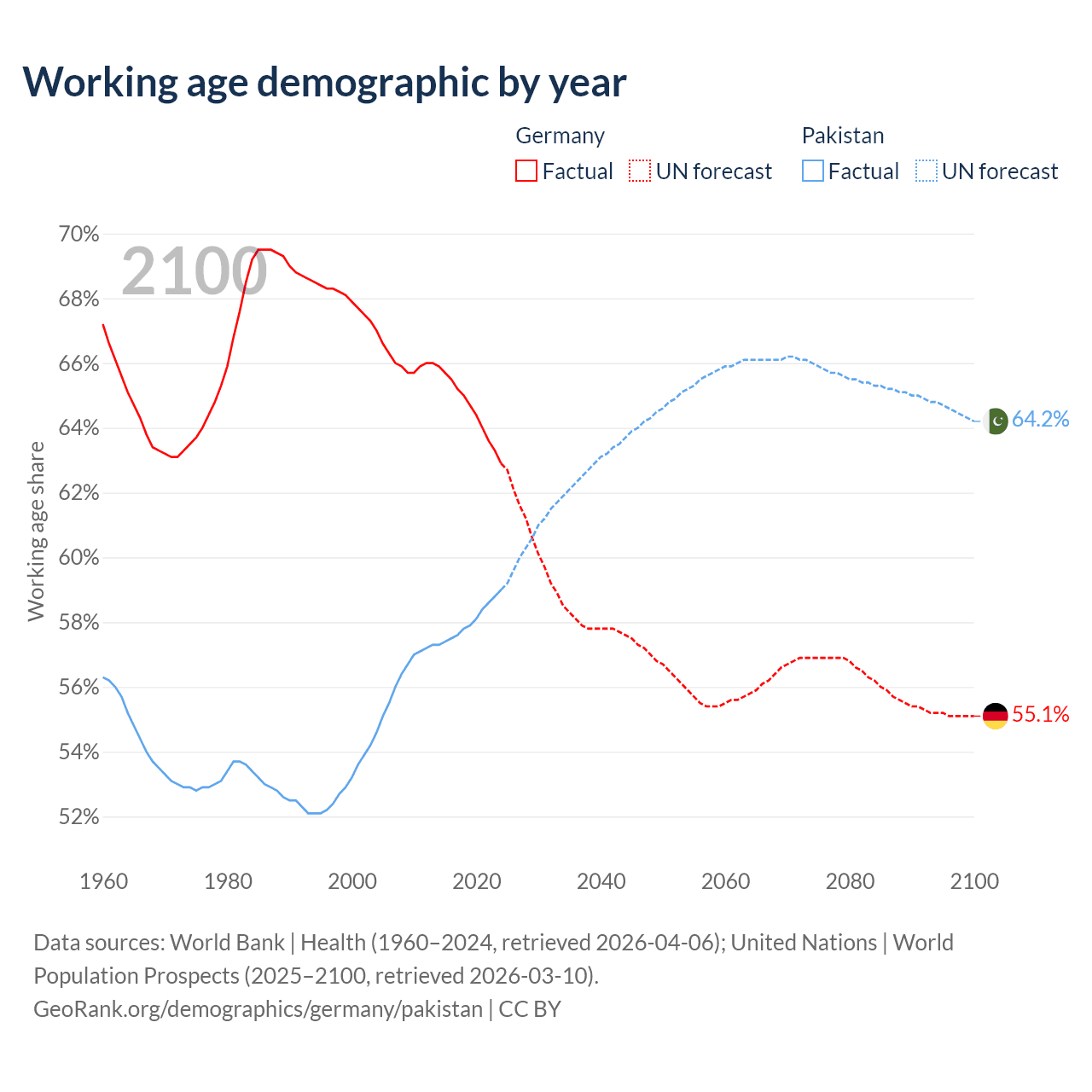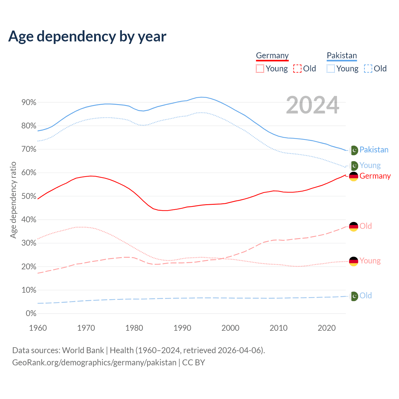 - Germany is ranked 9/196 by median age (oldest to youngest) vs 154/196 for Pakistan.