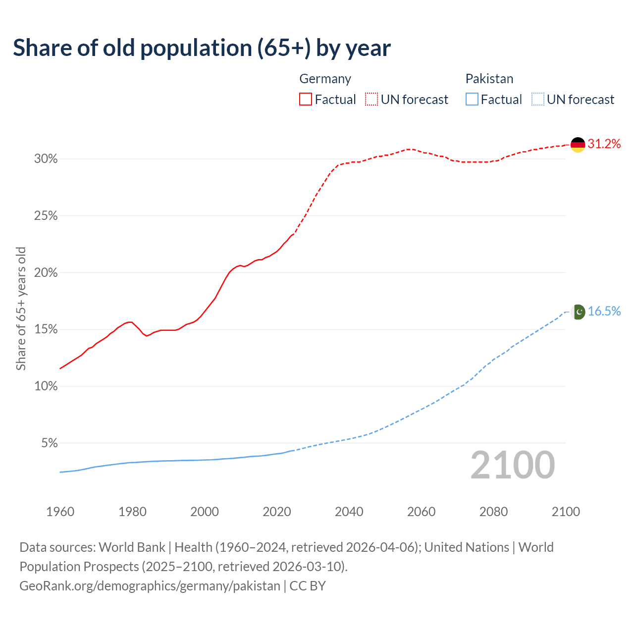 The share of older people aged 65 and over is 23.2% in Germany and 4.28% in Pakistan. Life expectancy in Germany compared to Pakistan .