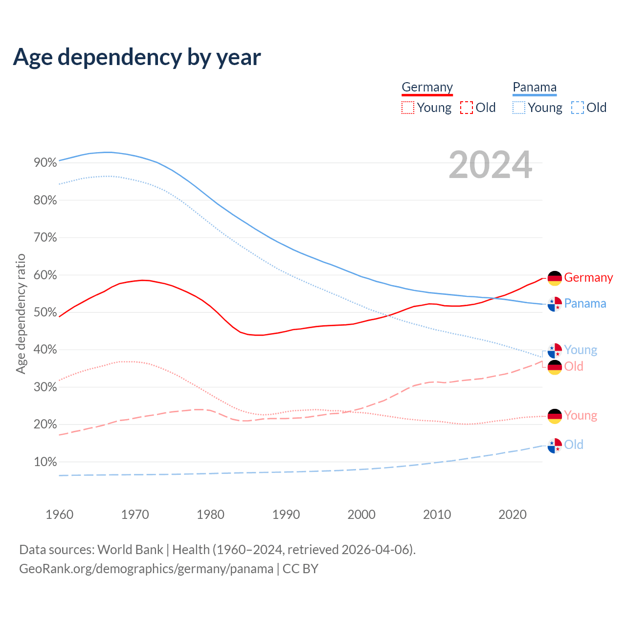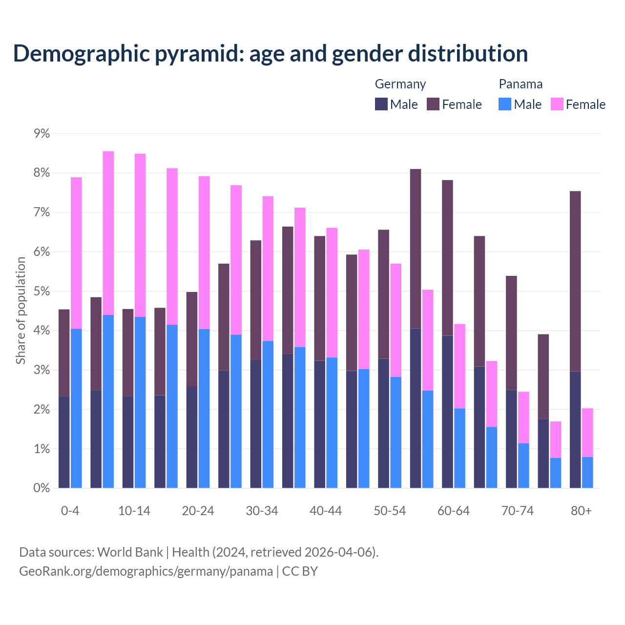 - Germany is ranked 9/196 by median age (oldest to youngest) vs 94/196 for Panama.