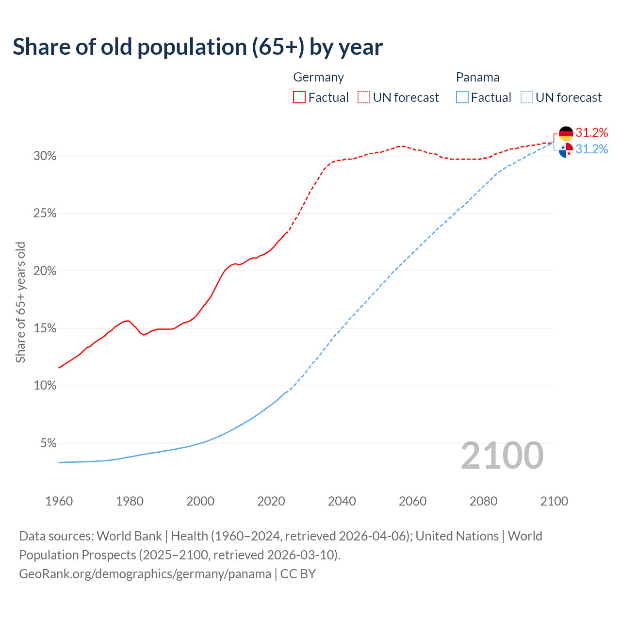 - The share of old-age demographic (65+) in Germany is 23.2% vs 9.35% in Panama.