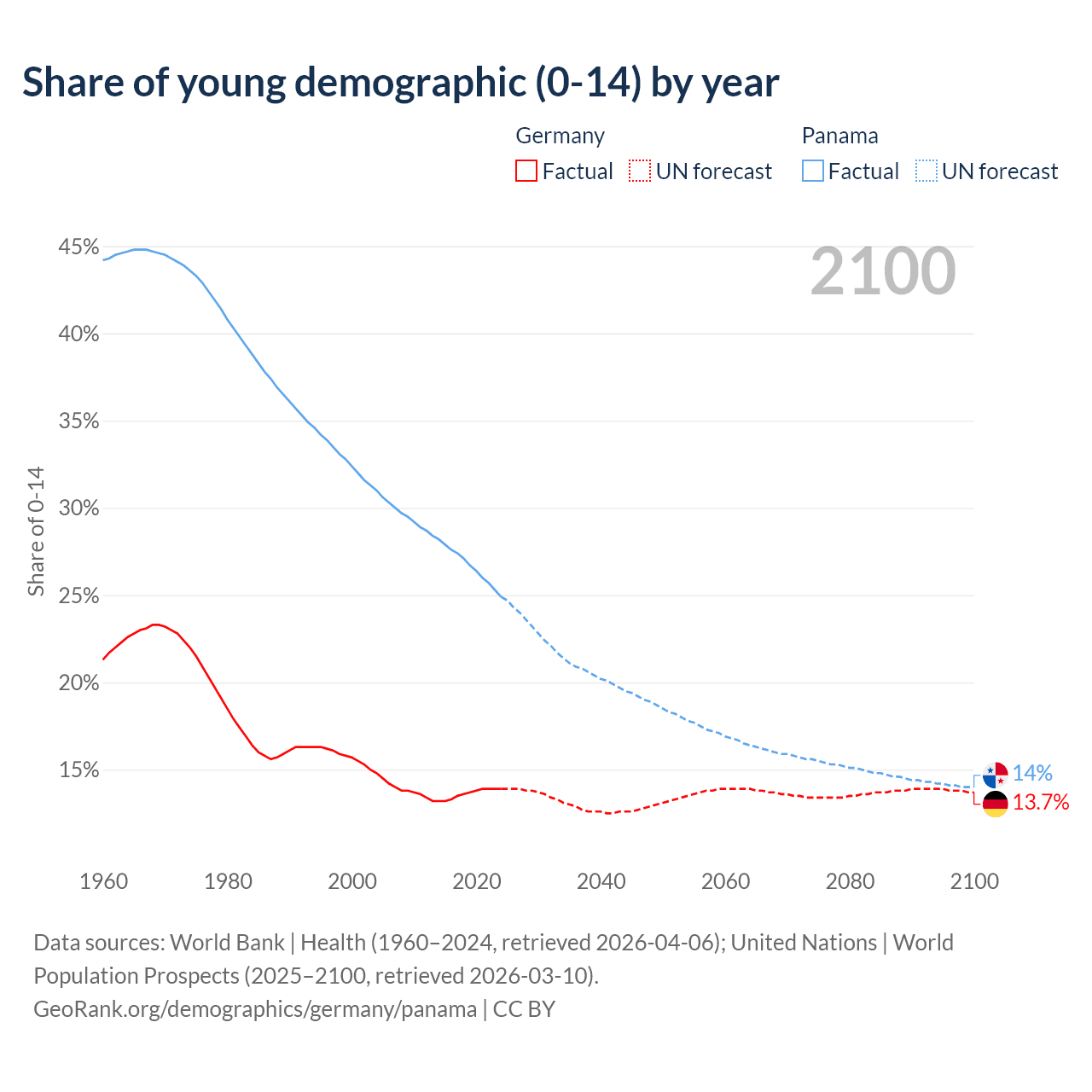 - The share of young demographic (0-15 years old) in Germany is 13.9% vs 24.9% in Panama.