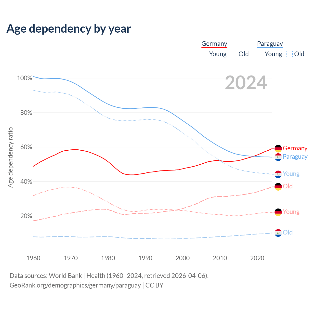 - Germany is ranked 9/196 by median age (oldest to youngest) vs 118/196 for Paraguay.