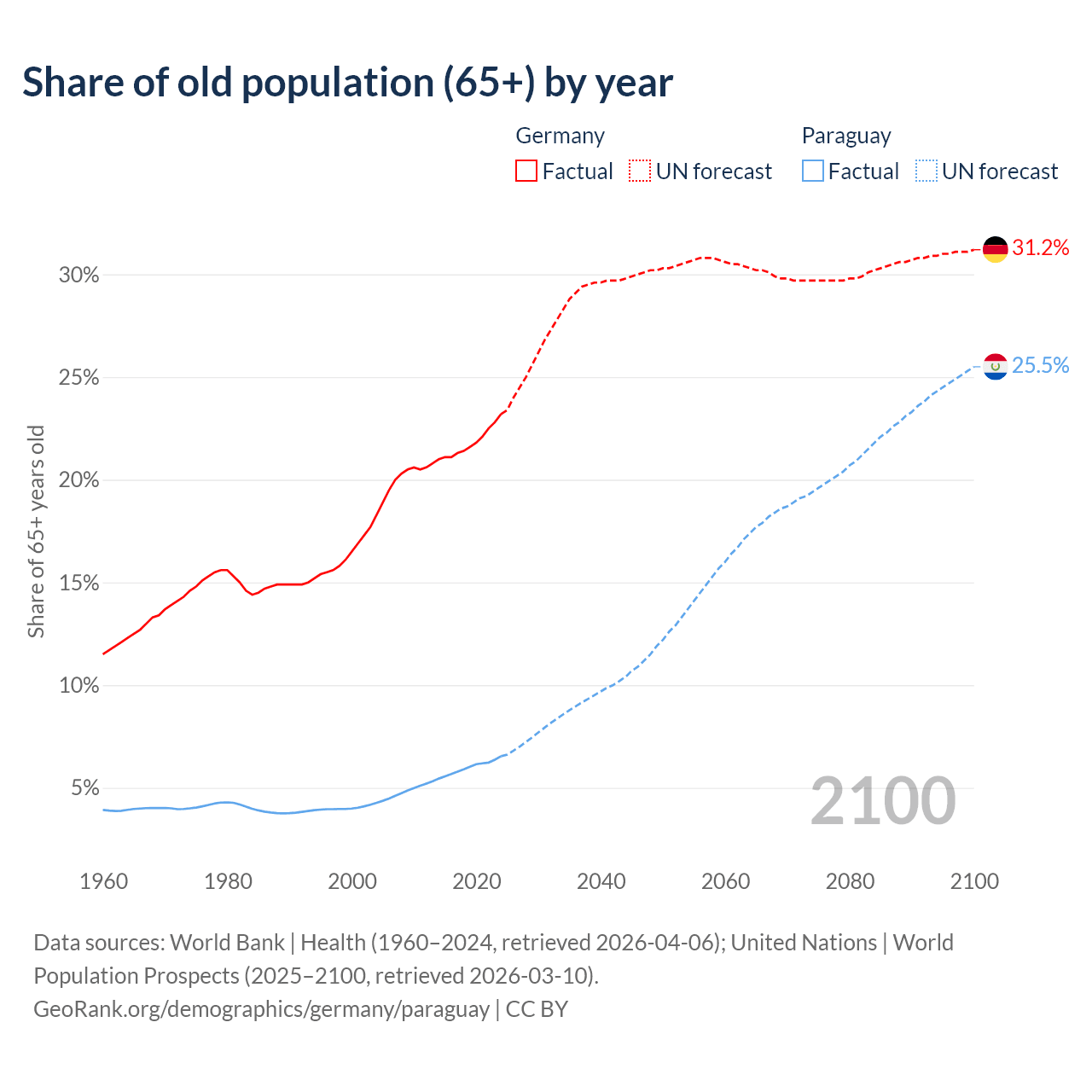 The share of older people aged 65 and over is 23.2% in Germany and 6.54% in Paraguay. Life expectancy in Germany compared to Paraguay .