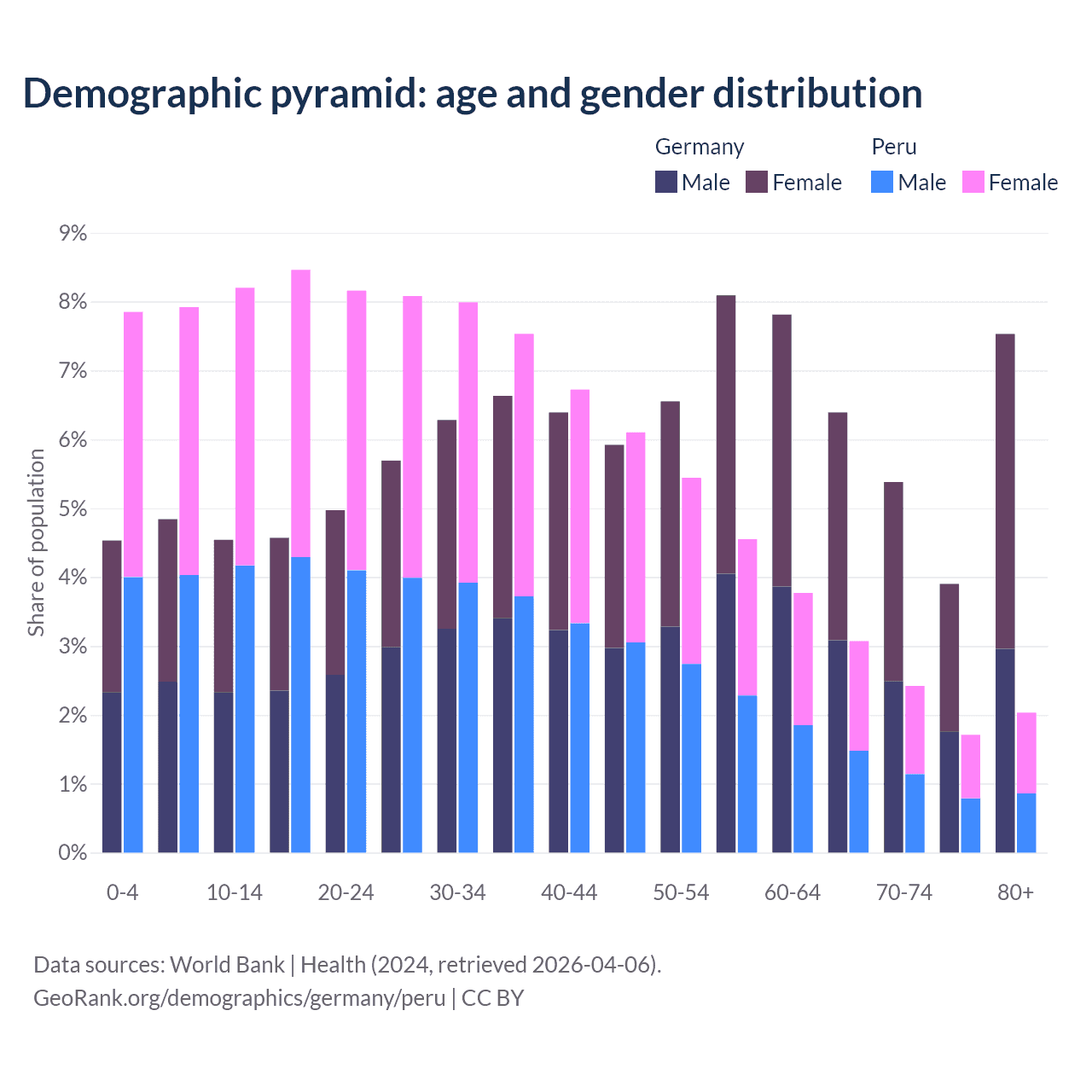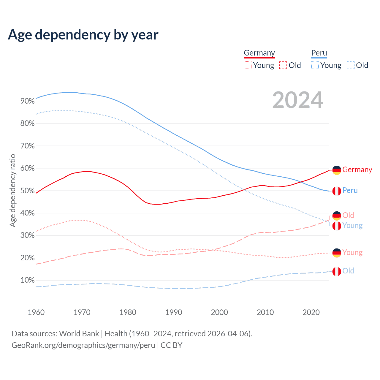 - Germany is ranked 9/196 by median age (oldest to youngest) vs 97/196 for Peru.