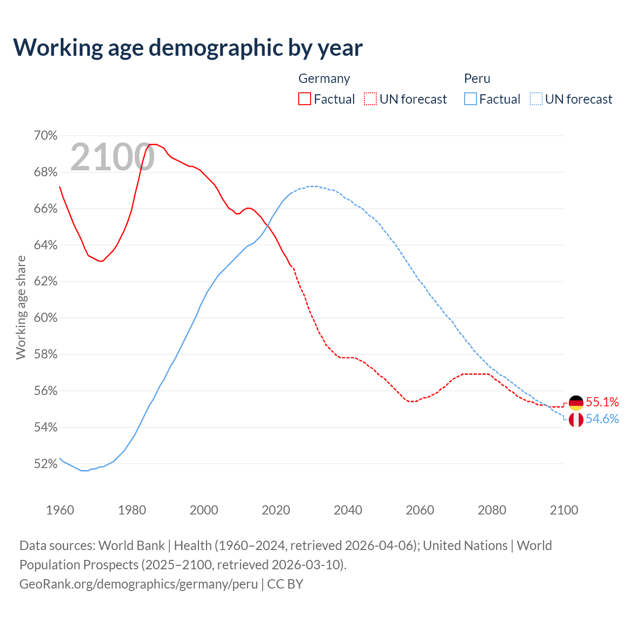 - Germany has 51.9M working age adults (aged 15-64) vs 23.4M in Peru.