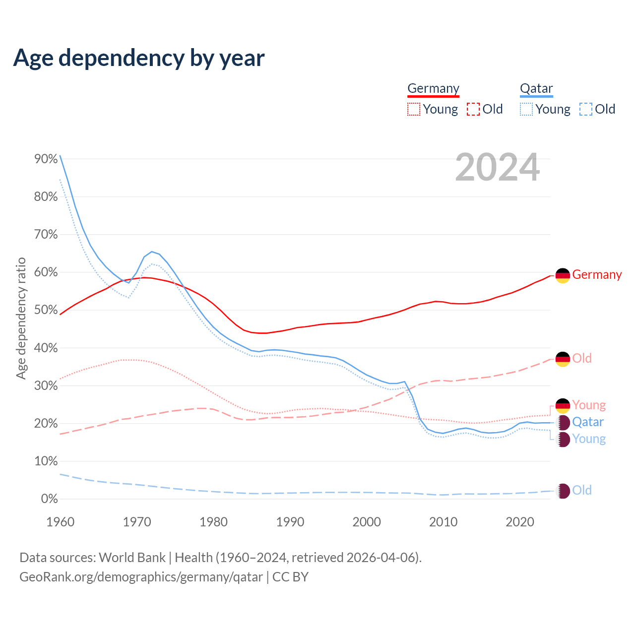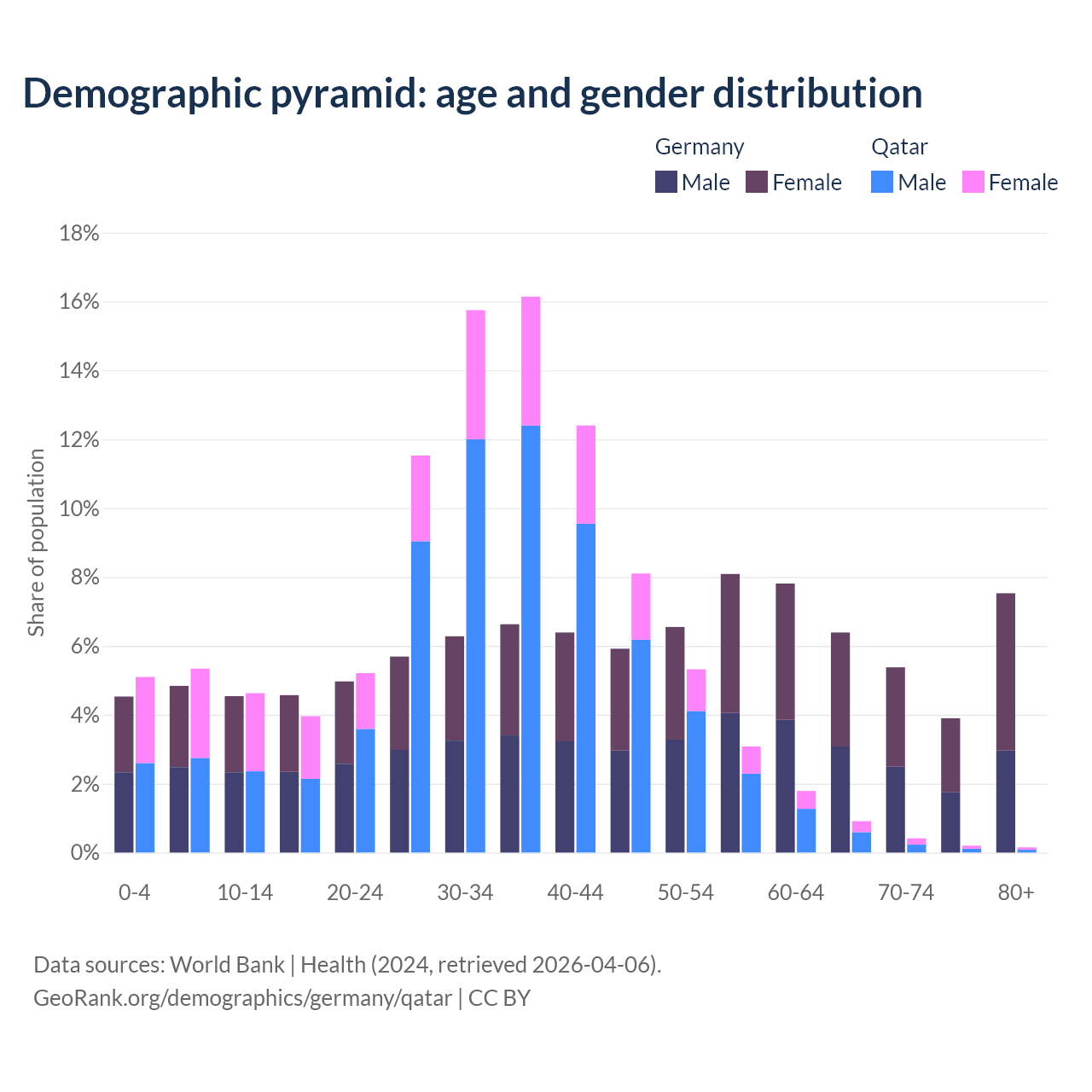 - Germany is ranked 9/196 by median age (oldest to youngest) vs 78/196 for Qatar.
