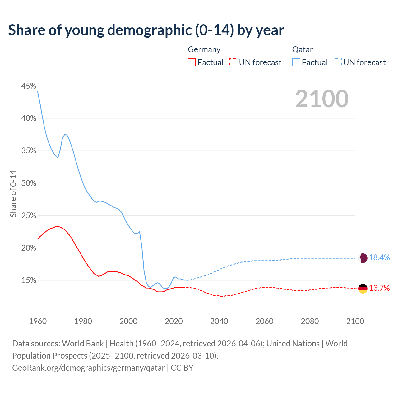 - The share of young demographic (0-15 years old) in Germany is 13.9% vs 15.1% in Qatar.