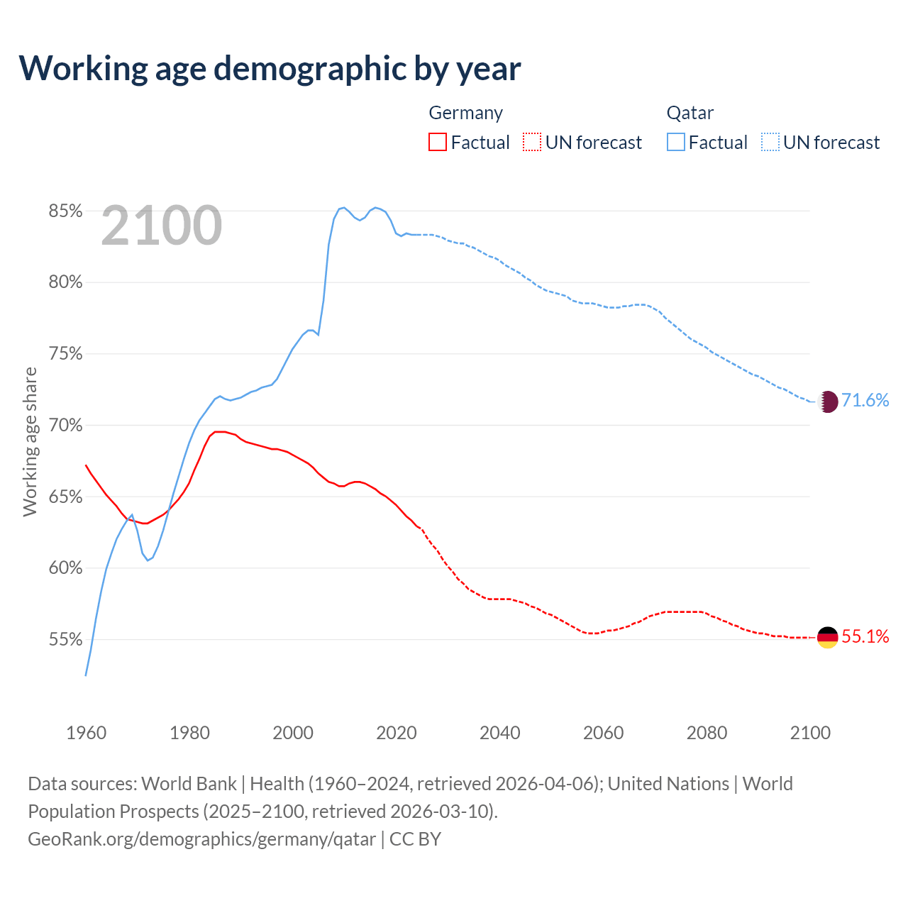 - Germany has 51.9M working age adults (aged 15-64) vs 2.5M in Qatar.