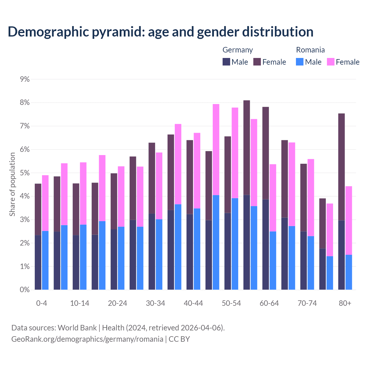 - Germany is ranked 9/196 by median age (oldest to youngest) vs 23/196 for Romania.
