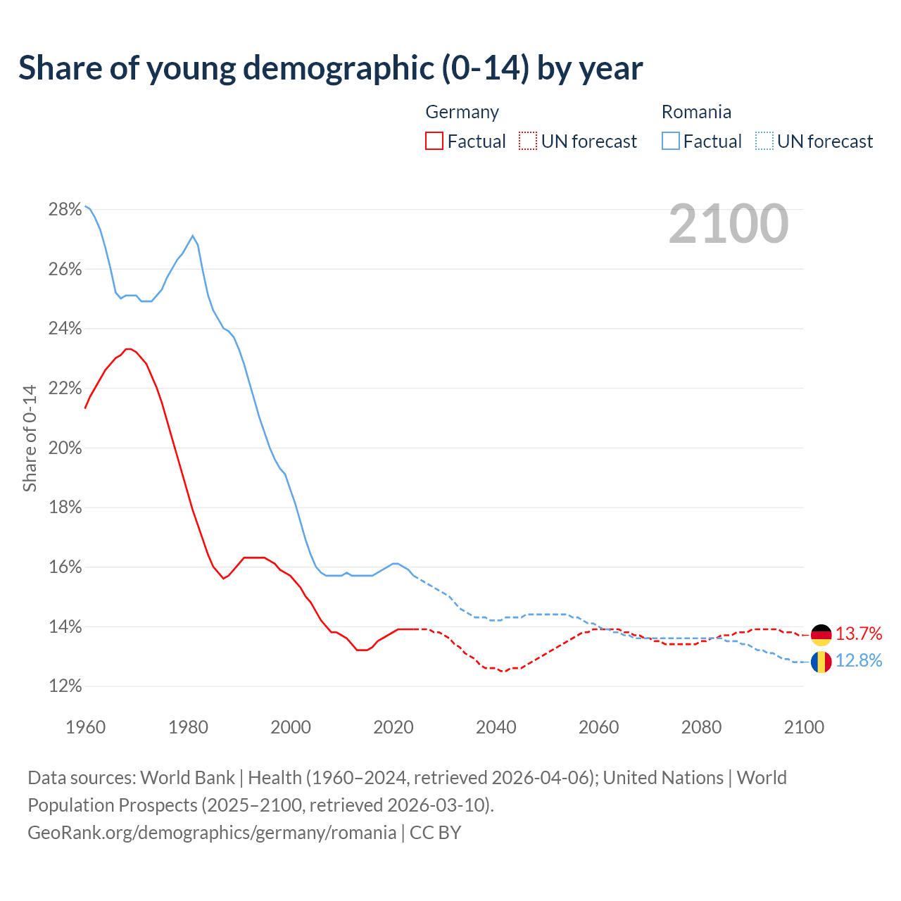 - The share of young demographic (0-15 years old) in Germany is 13.9% vs 15.7% in Romania.