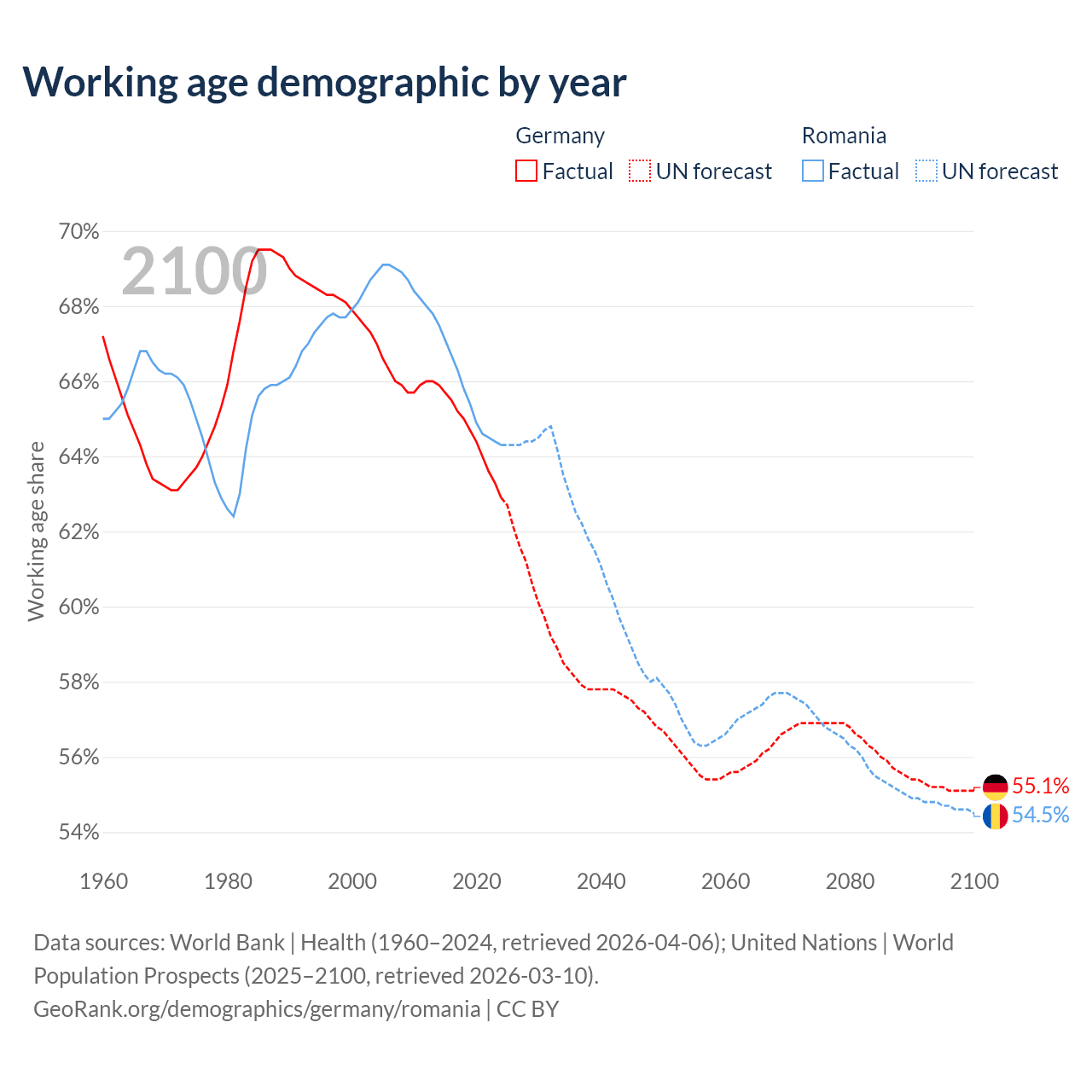 - Germany has 51.9M working age adults (aged 15-64) vs 12.1M in Romania.