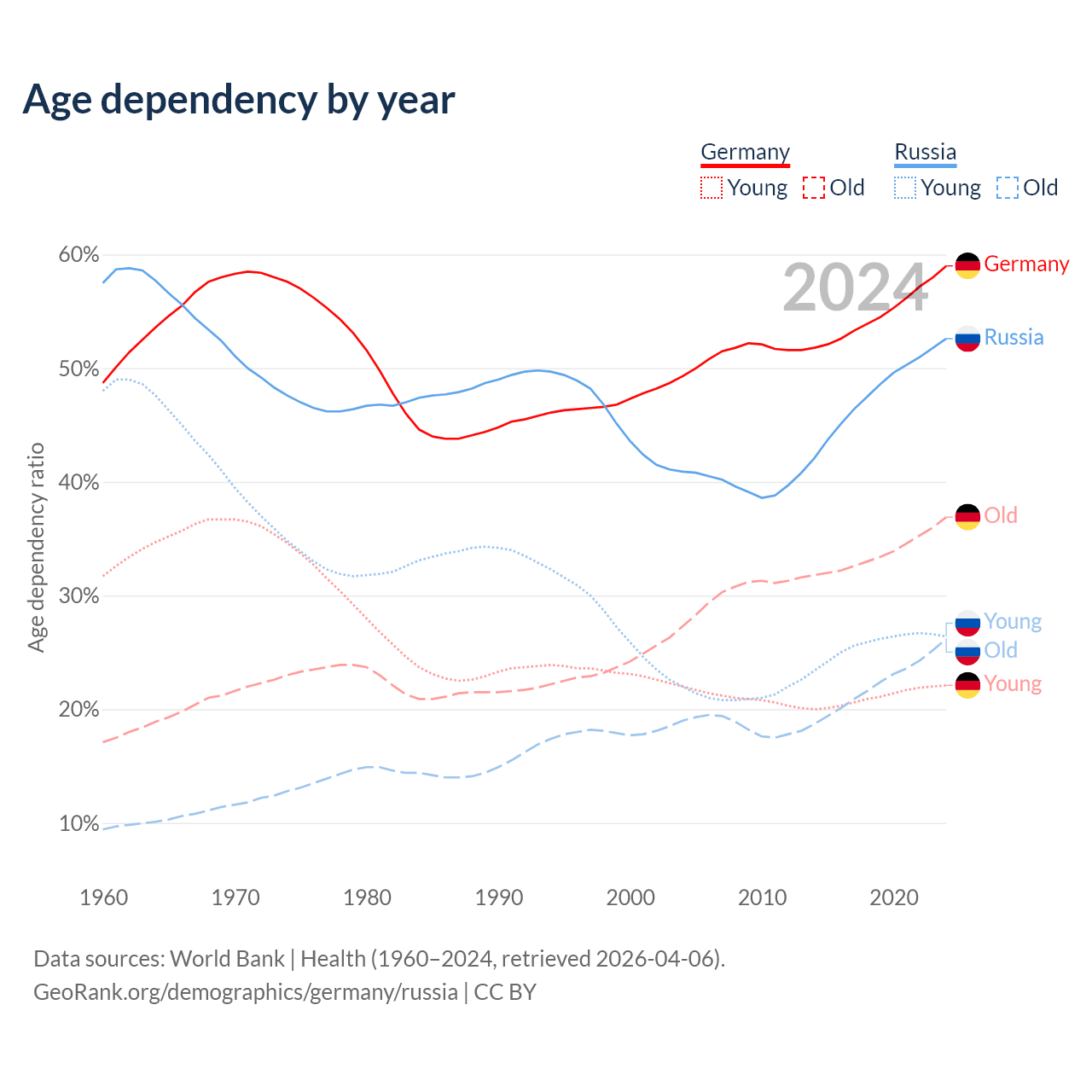 - Germany is ranked 9/196 by median age (oldest to youngest) vs 42/196 for Russia.