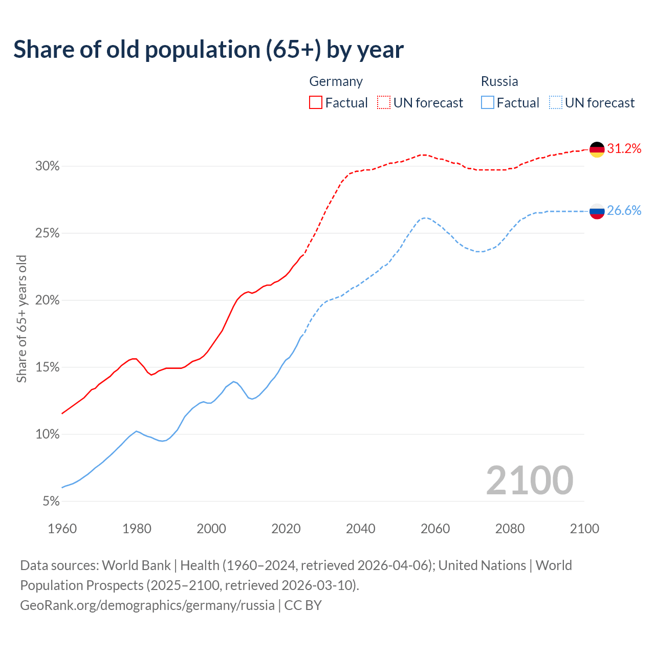 The share of older people aged 65 and over is 23.2% in Germany and 17.2% in Russia. Life expectancy in Germany compared to Russia .