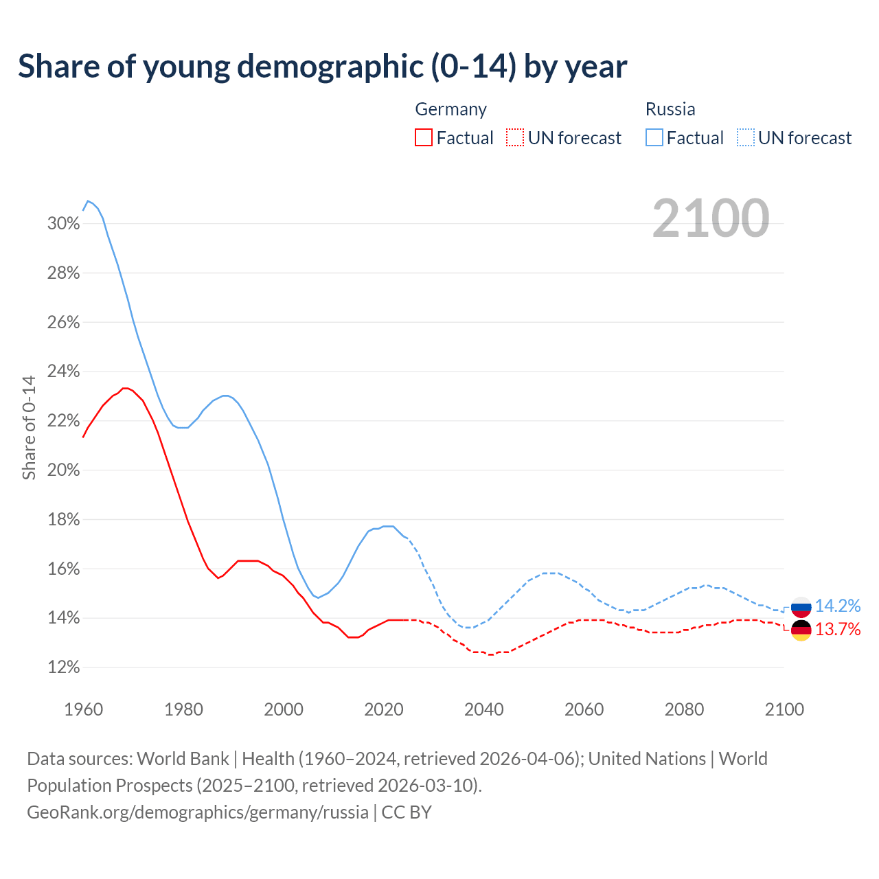 - The share of young demographic (0-15 years old) in Germany is 13.9% vs 17.3% in Russia.