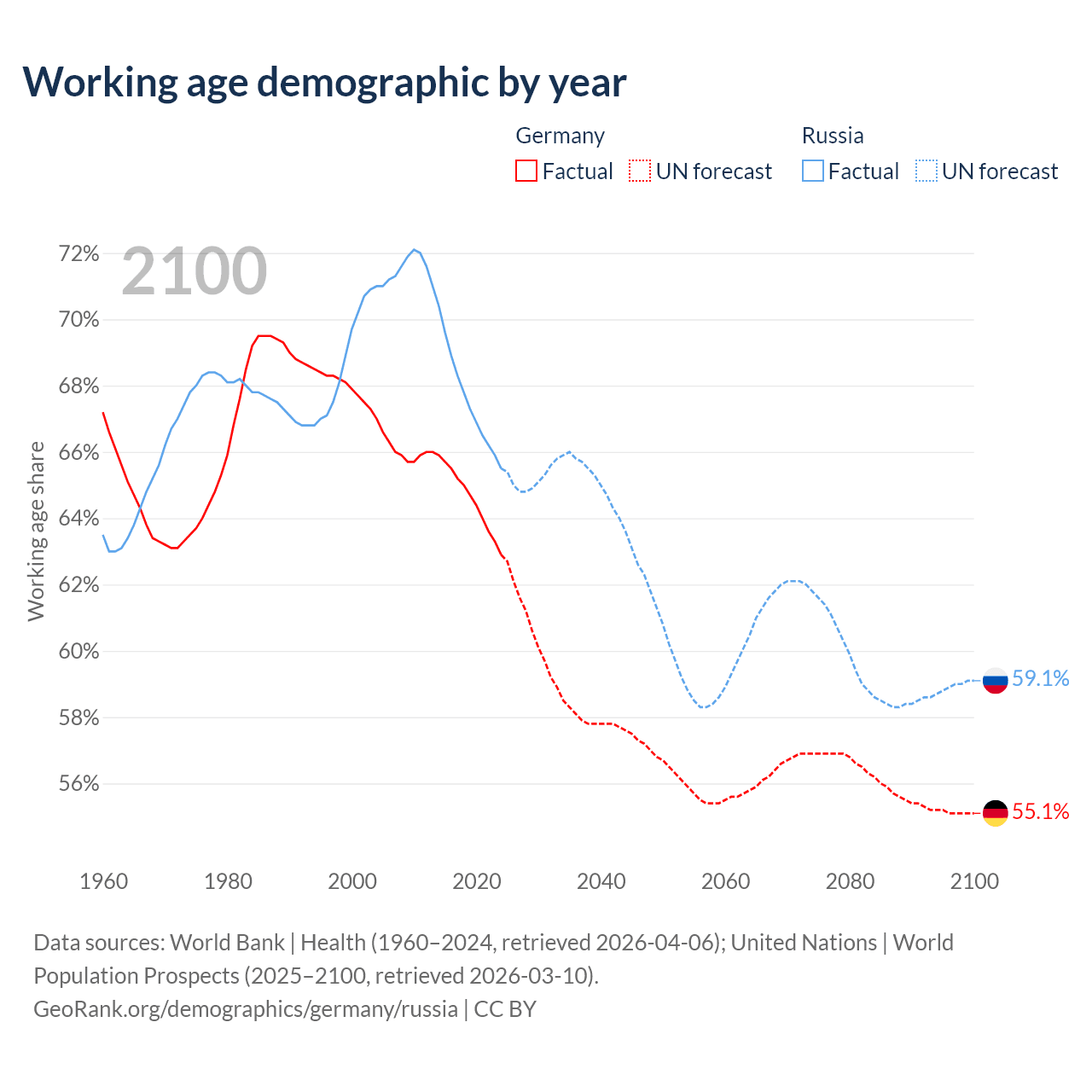 - Germany has 51.9M working age adults (aged 15-64) vs 93M in Russia.