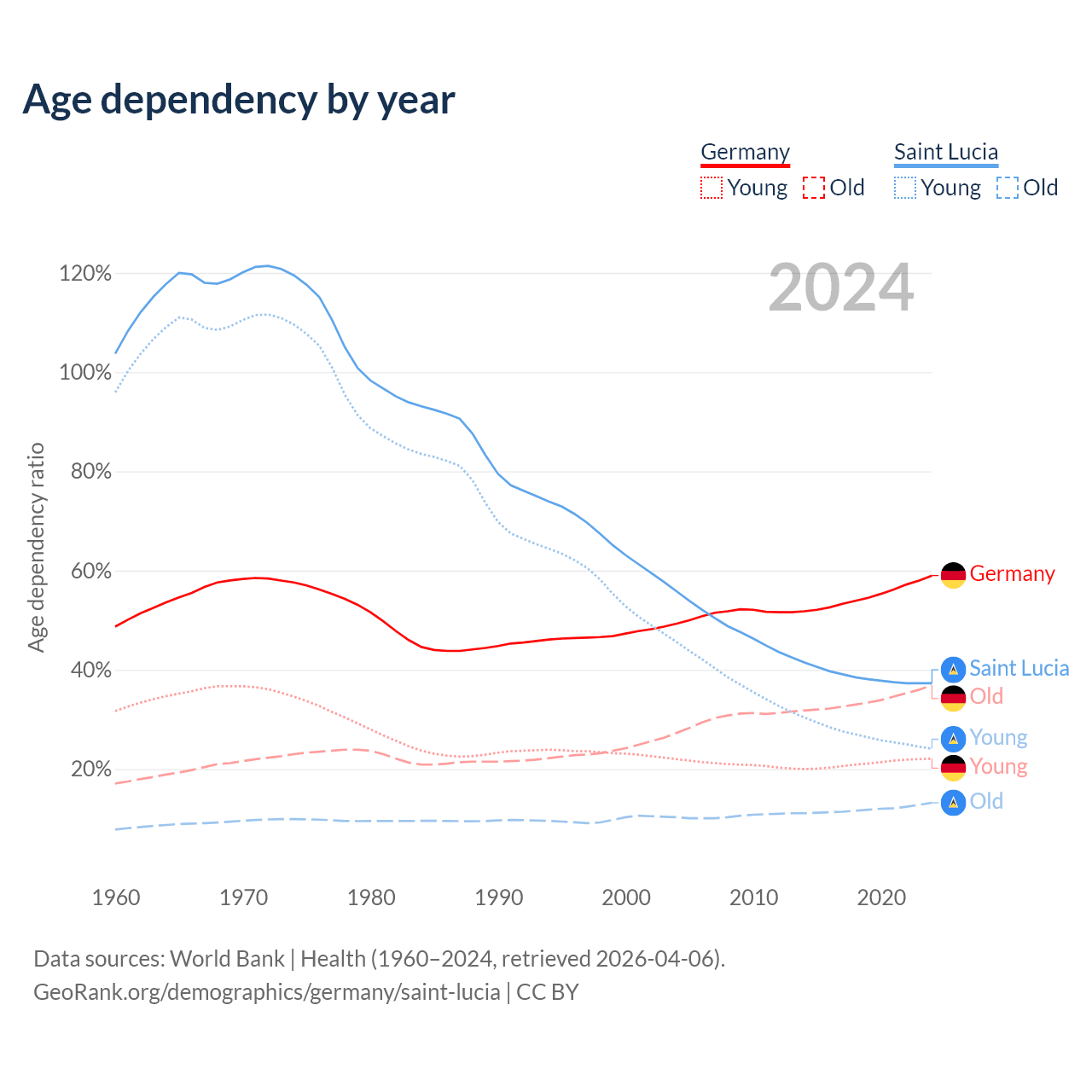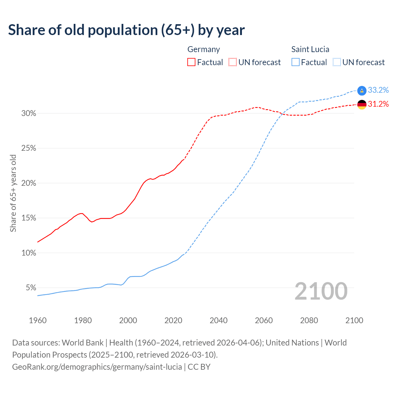 - The share of old-age demographic (65+) in Germany is 23.2% vs 9.62% in Saint Lucia.