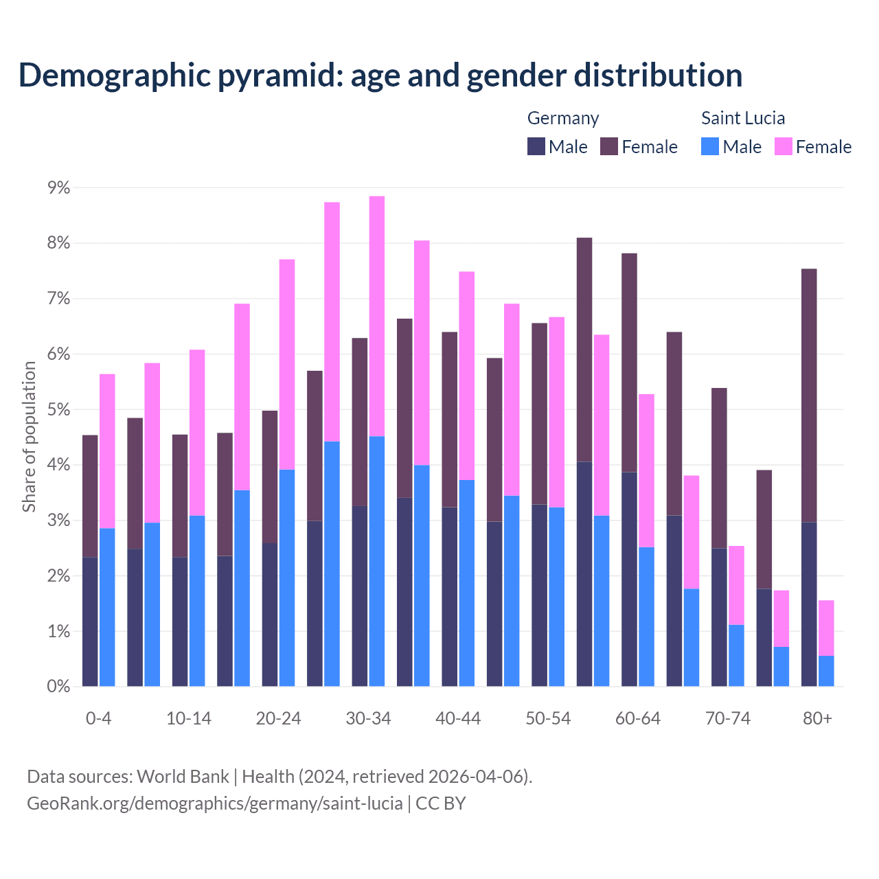 - Germany is ranked 9/196 by median age (oldest to youngest) vs 74/196 for Saint Lucia.