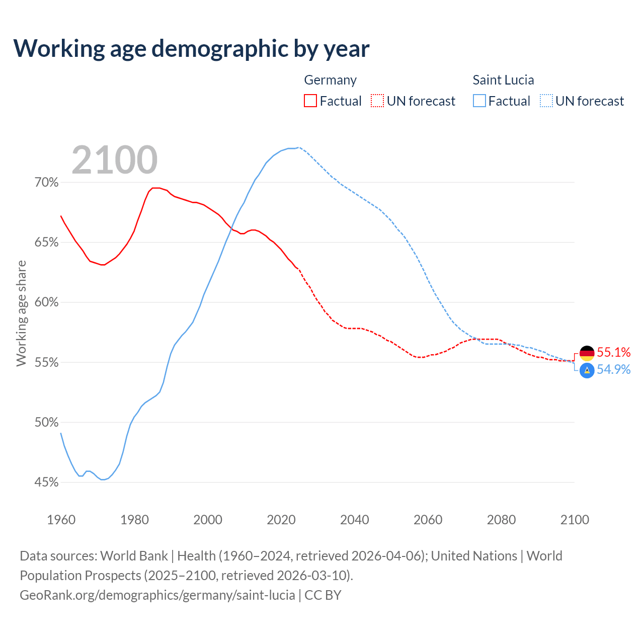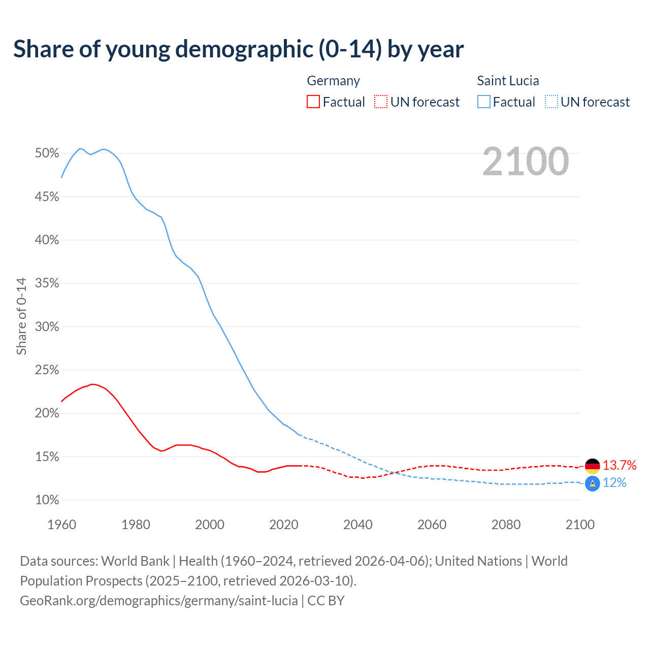 - The share of young demographic (0-15 years old) in Germany is 13.9% vs 17.5% in Saint Lucia.