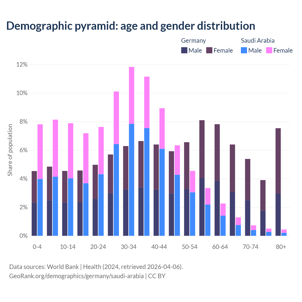 - Germany is ranked 9/196 by median age (oldest to youngest) vs 98/196 for Saudi Arabia.