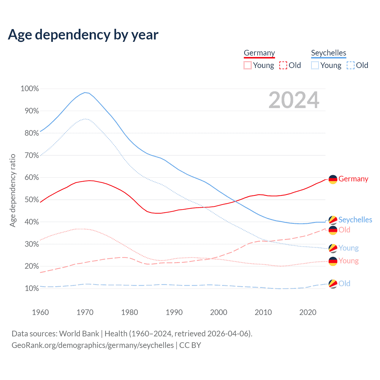 - Germany is ranked 9/196 by median age (oldest to youngest) vs 76/196 for the Seychelles.