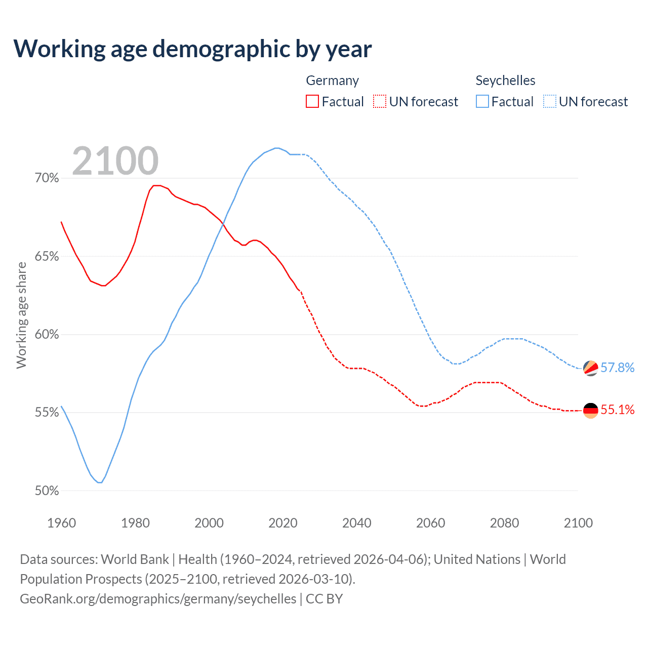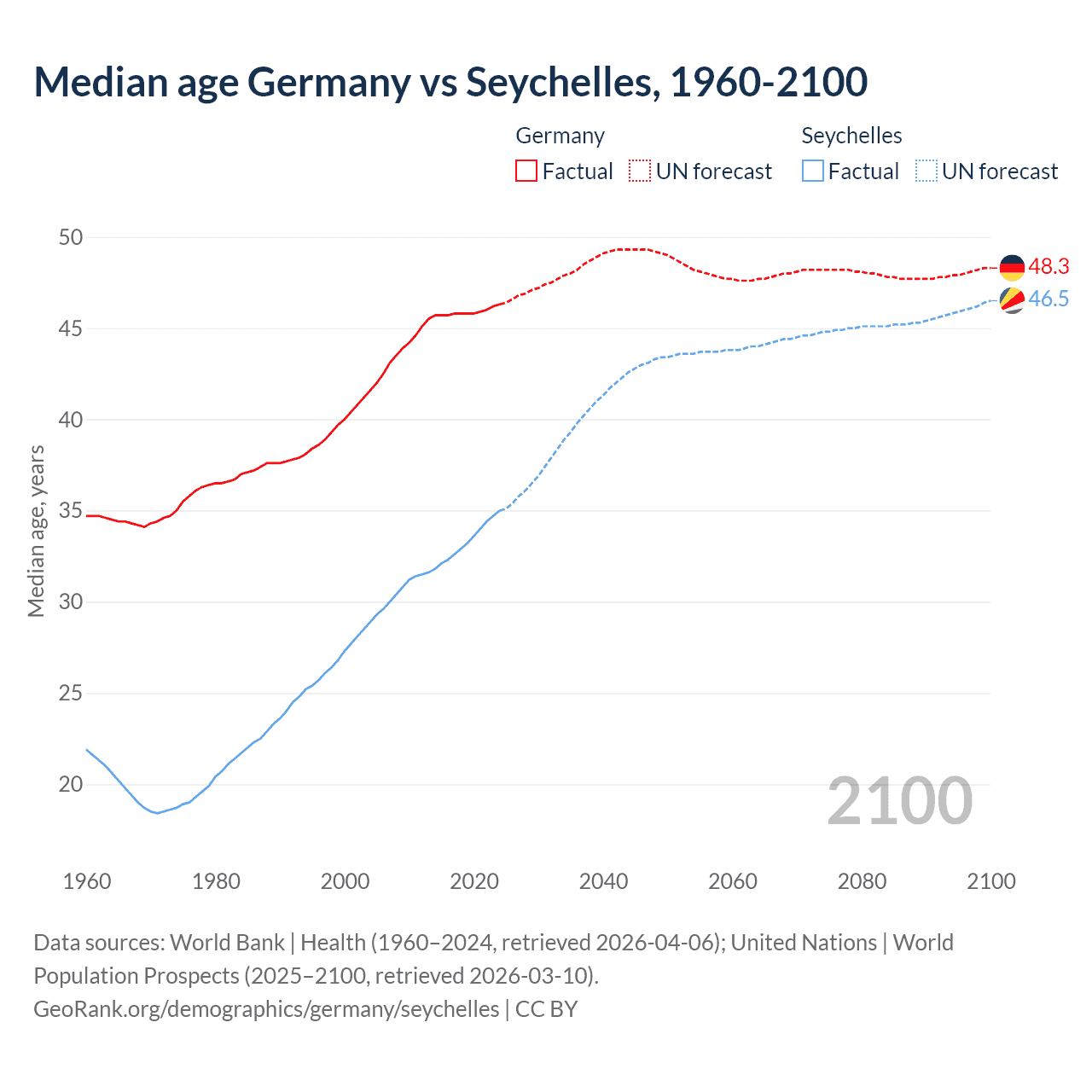 Median age Germany vs Seychelles, 1960-2100