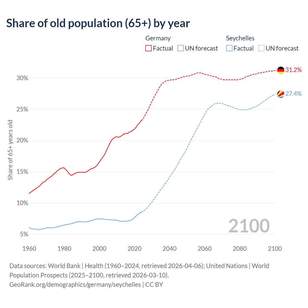 The share of older people aged 65 and over is 23.2% in Germany and 8.54% in the Seychelles. Life expectancy in Germany compared to the Seychelles .