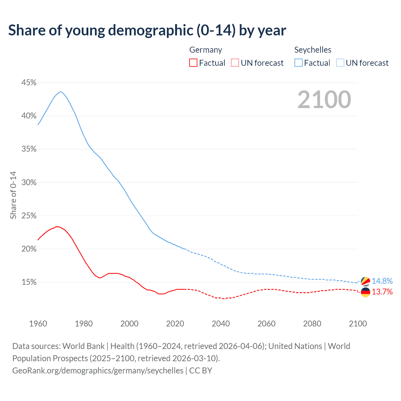 - The share of young demographic (0-15 years old) in Germany is 13.9% vs 20% in the Seychelles.