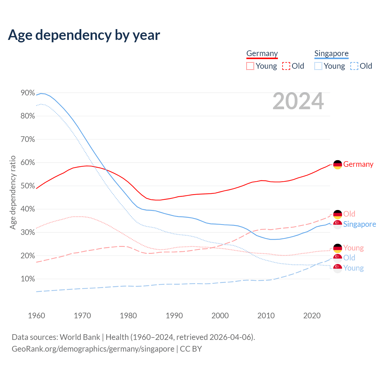 - Germany is ranked 9/196 by median age (oldest to youngest) vs 68/196 for Singapore.