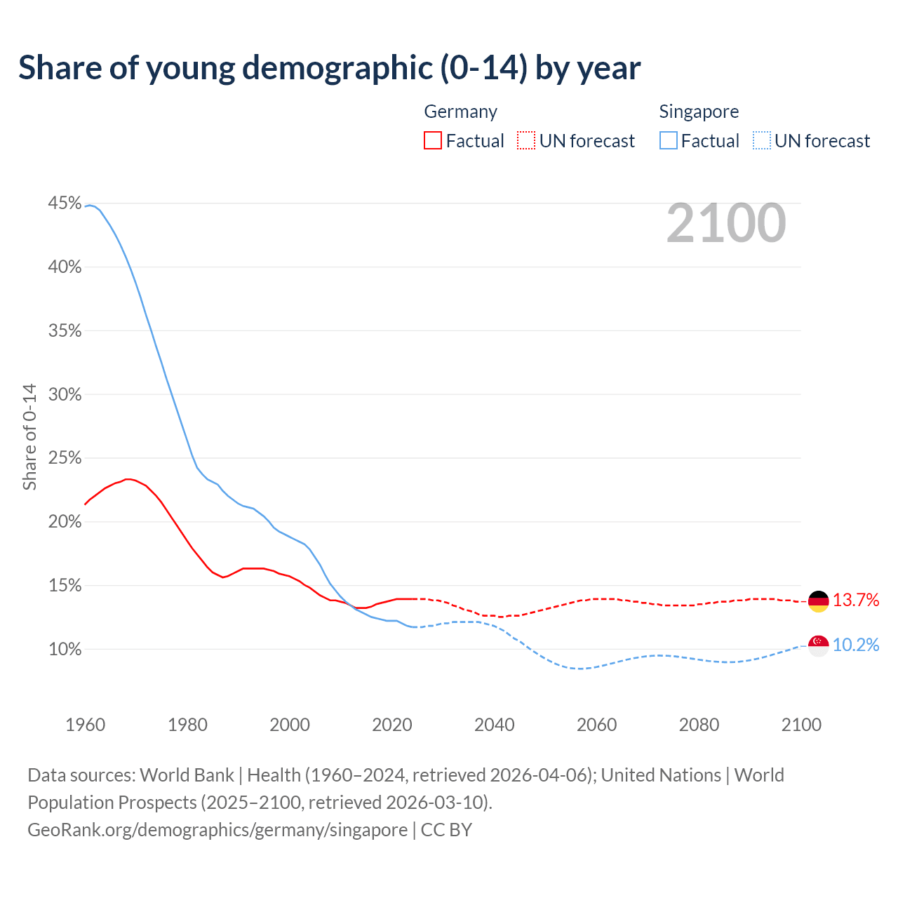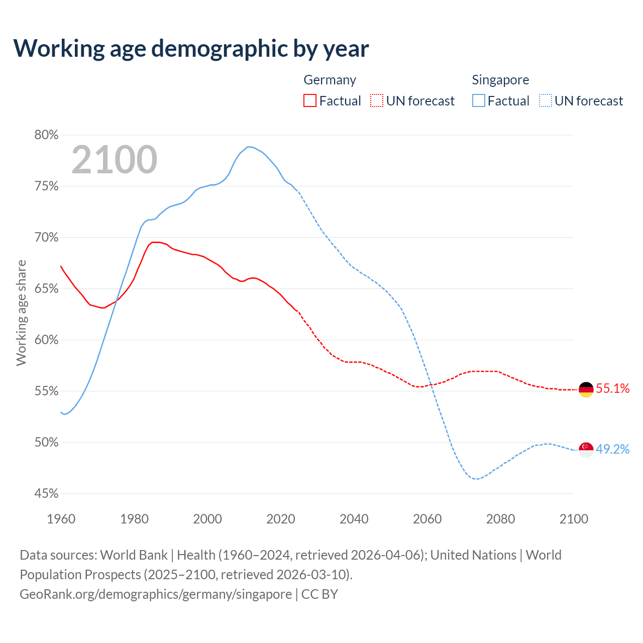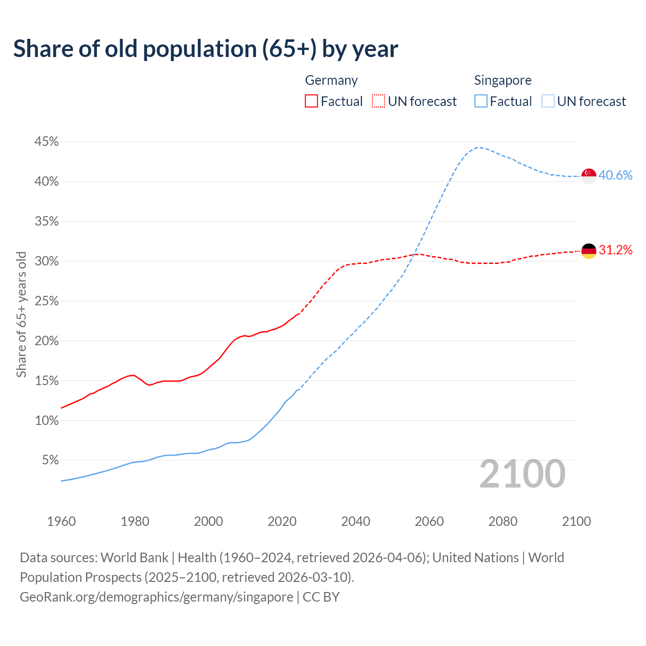 Median age Germany vs Singapore, 1960-2100