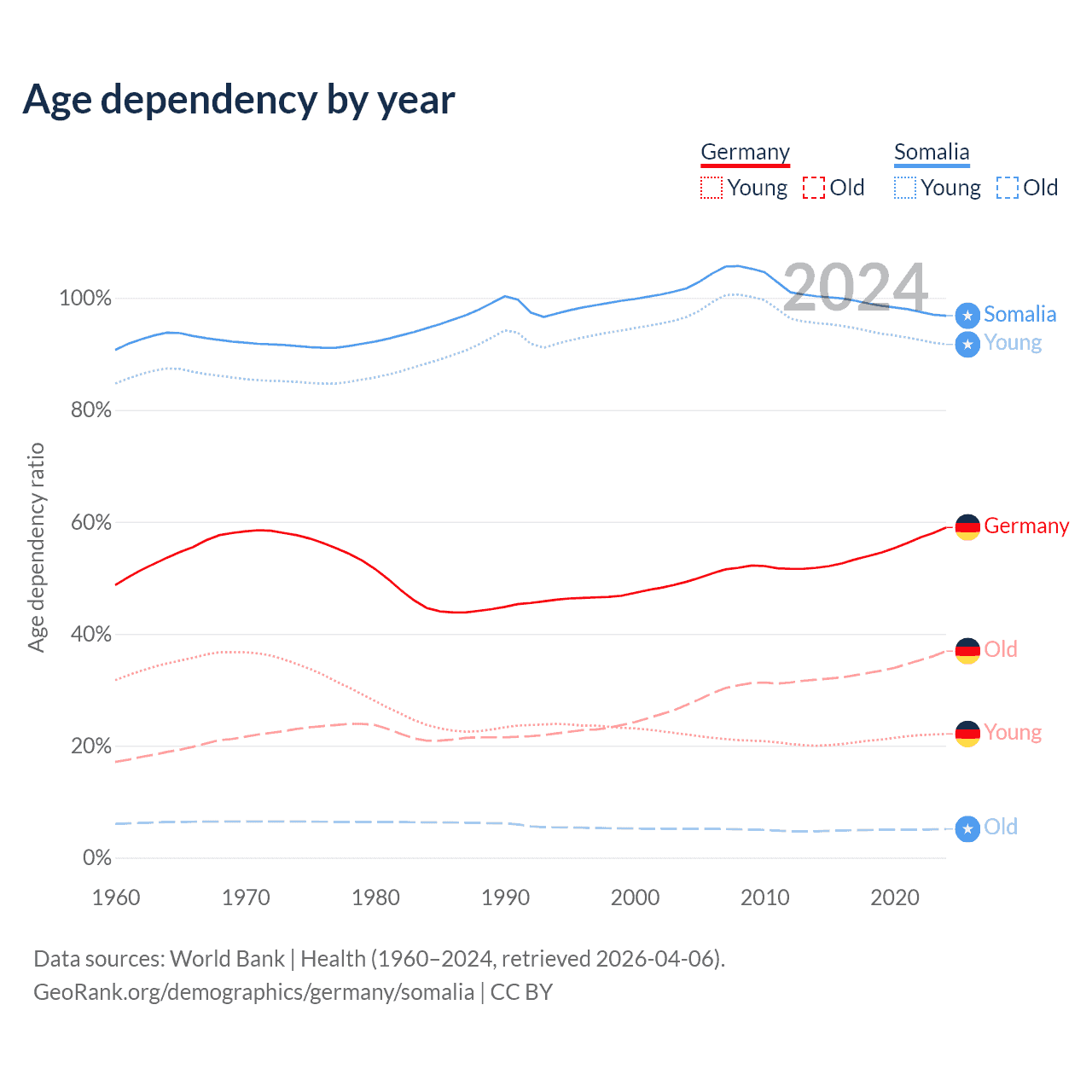 - Germany is ranked 9/196 by median age (oldest to youngest) vs 194/196 for Somalia.