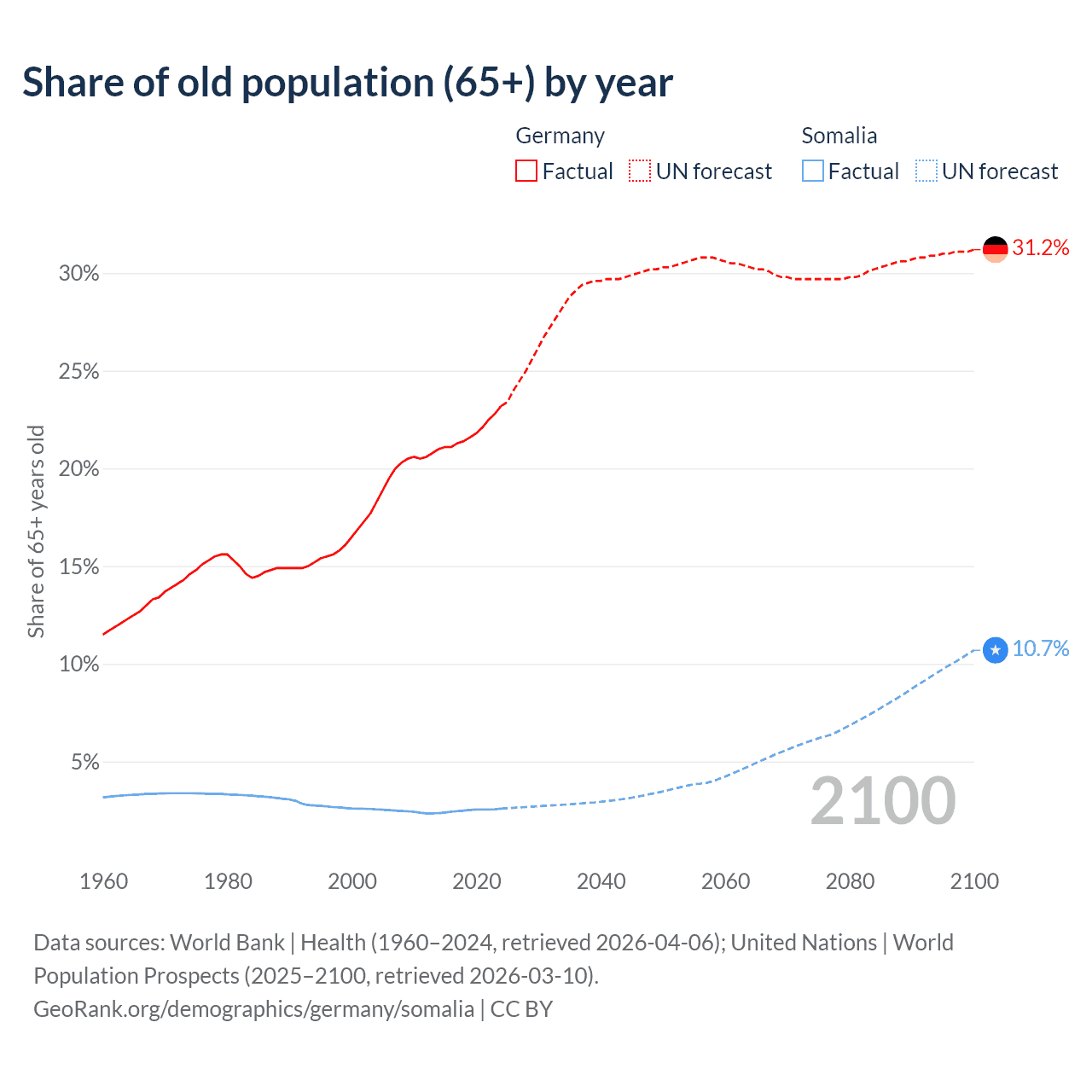 The share of older people aged 65 and over is 23.2% in Germany and 2.59% in Somalia. Life expectancy in Germany compared to Somalia .