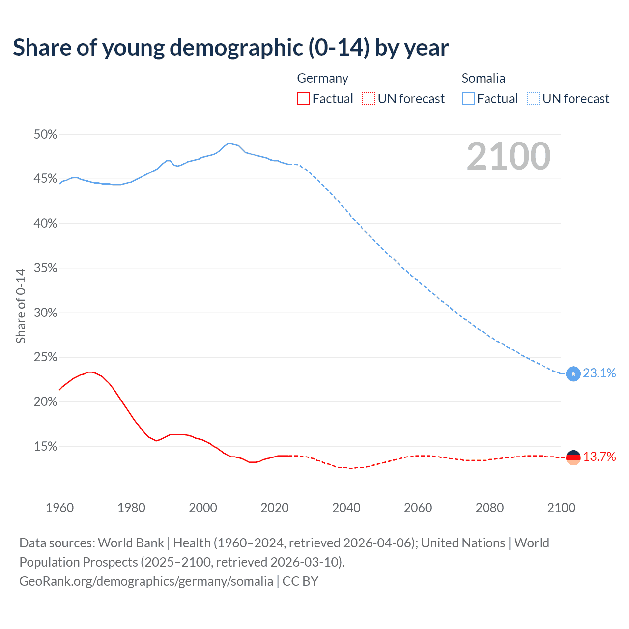 - The share of young demographic (0-15 years old) in Germany is 13.9% vs 46.6% in Somalia.