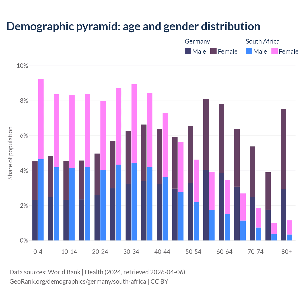 - Germany is ranked 9/196 by median age (oldest to youngest) vs 107/196 for South Africa.