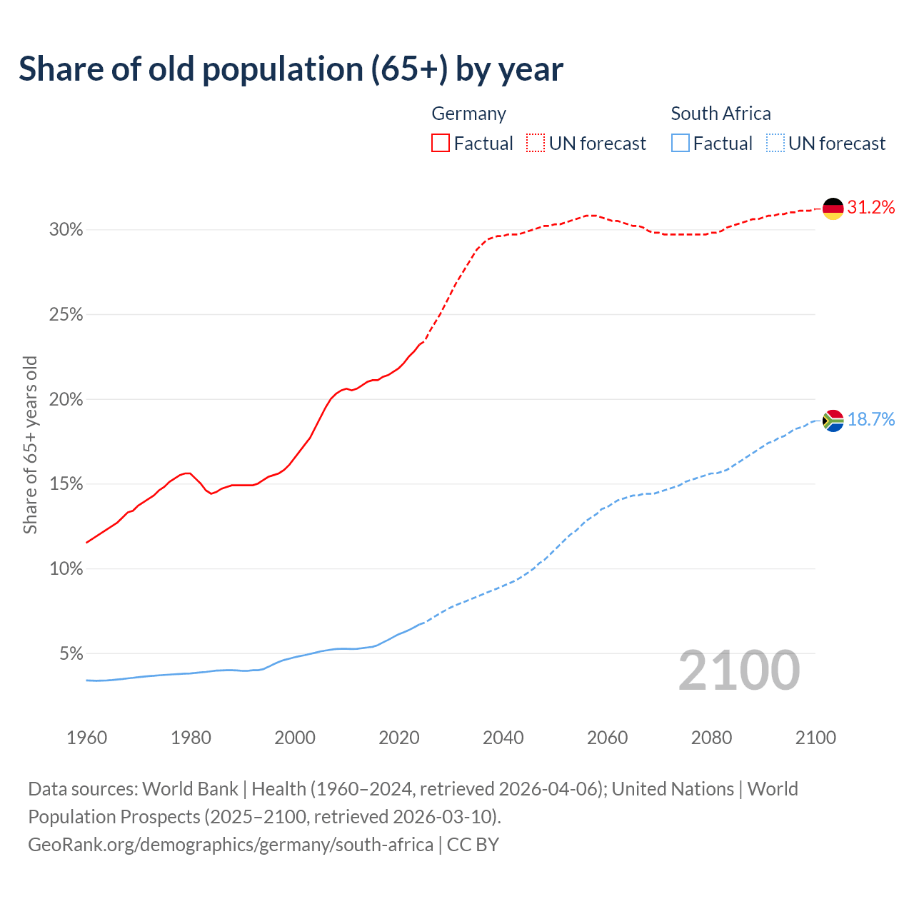 The share of older people aged 65 and over is 23.2% in Germany and 6.69% in South Africa. Life expectancy in Germany compared to South Africa .