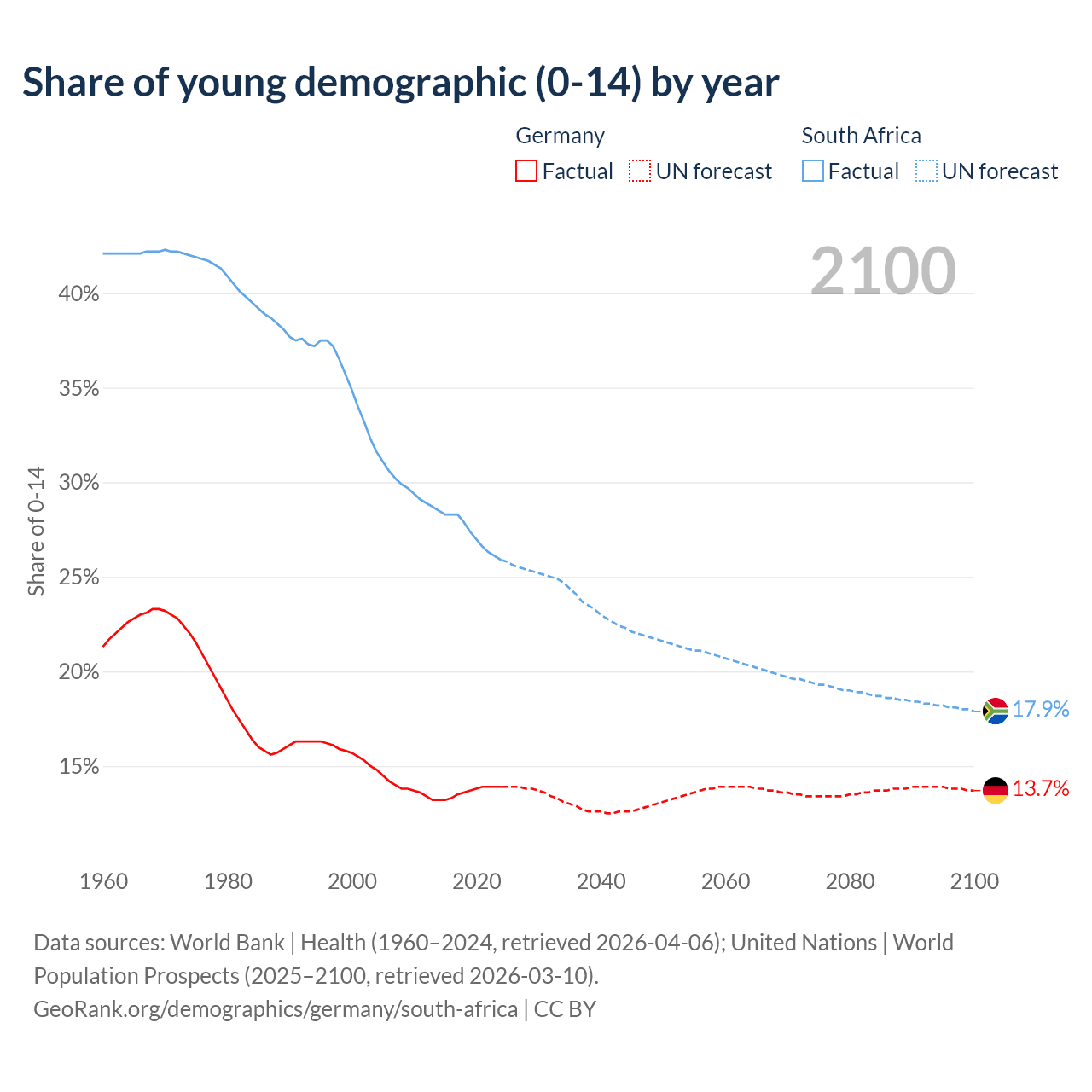 - The share of young demographic (0-15 years old) in Germany is 13.9% vs 25.9% in South Africa.