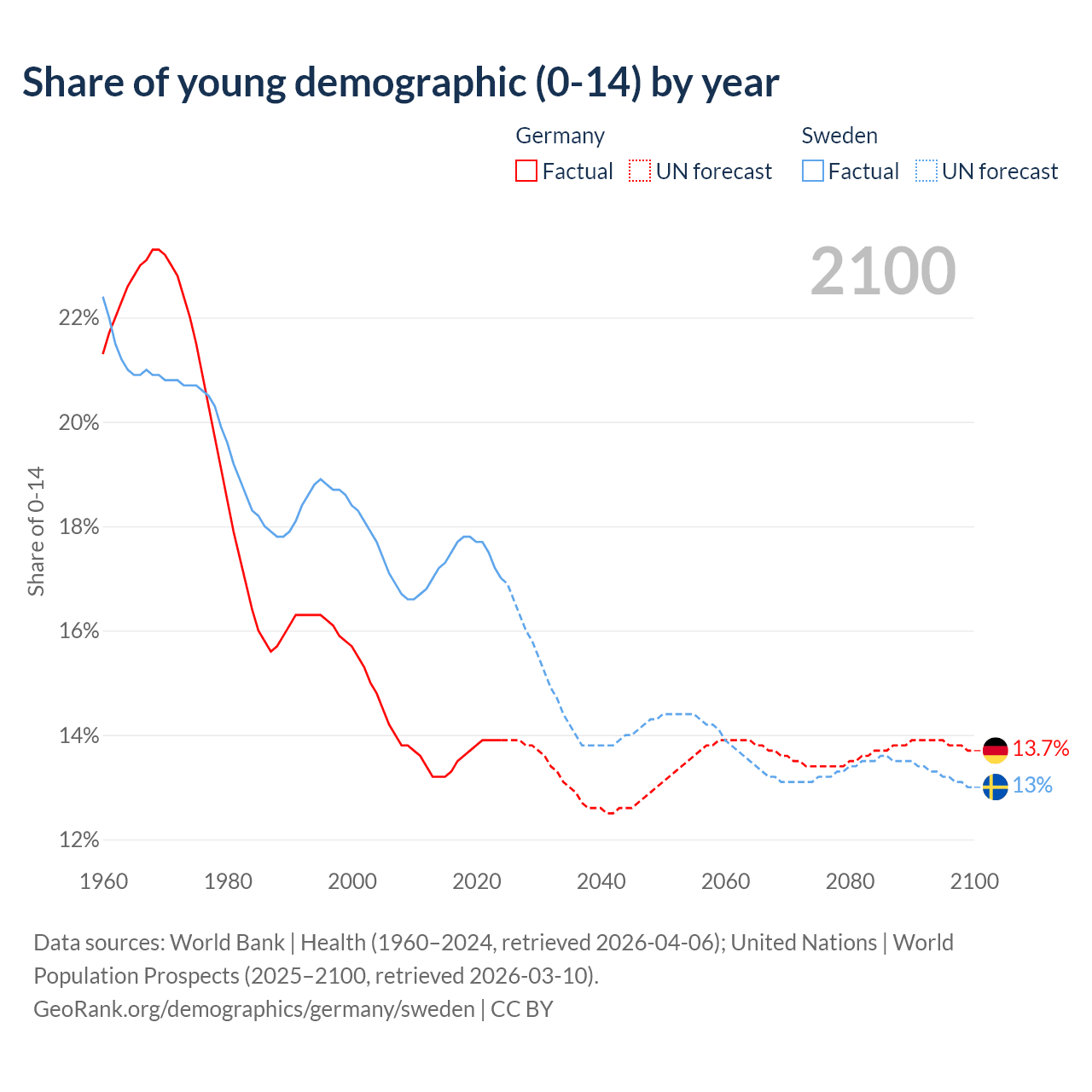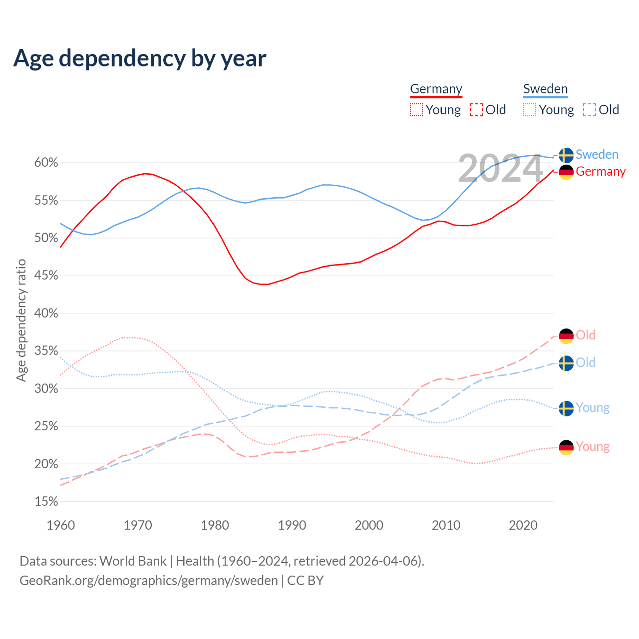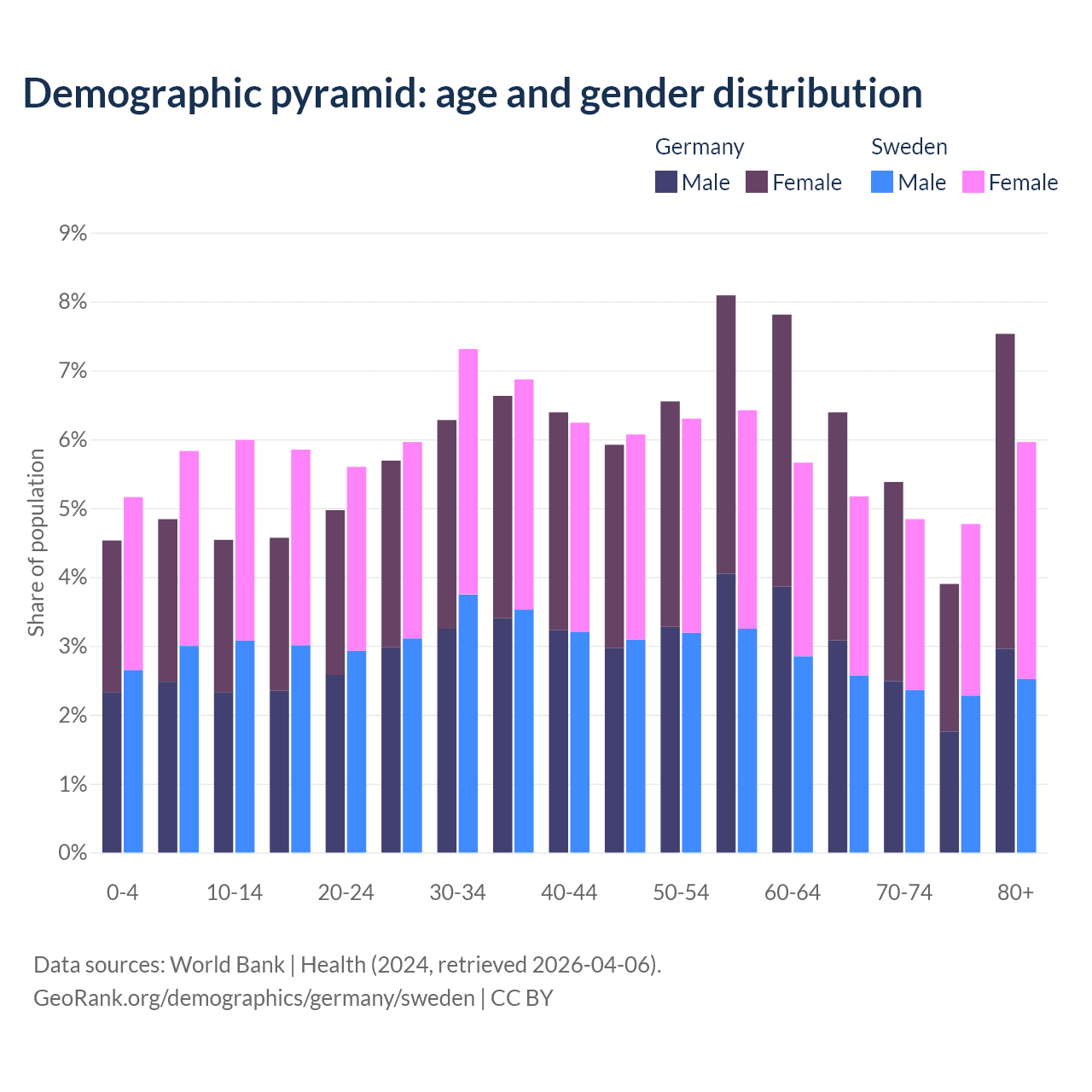 - Germany is ranked 9/196 by median age (oldest to youngest) vs 39/196 for Sweden.